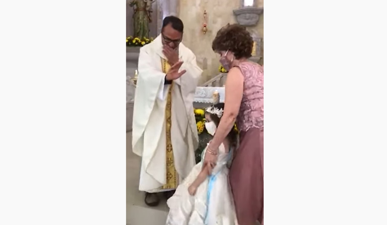司祭が祝福の為かざした手にハイタッチしちゃった少女に司祭も思わず吹き出す!