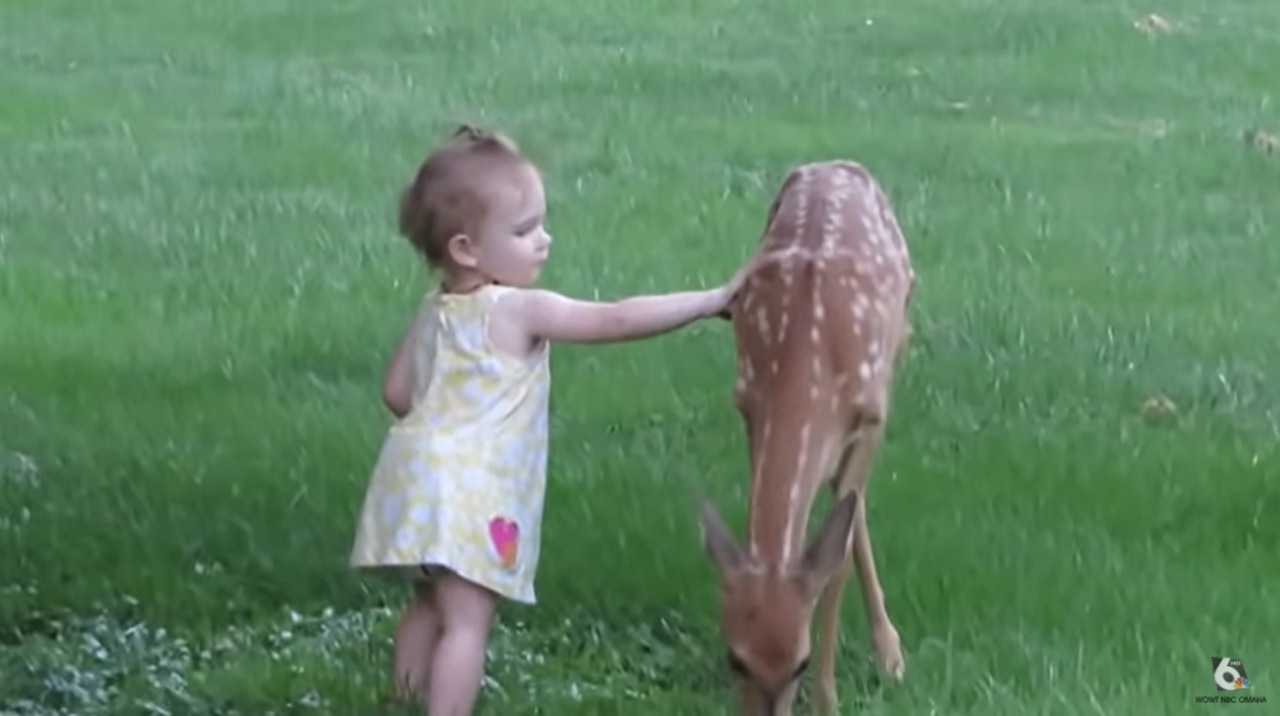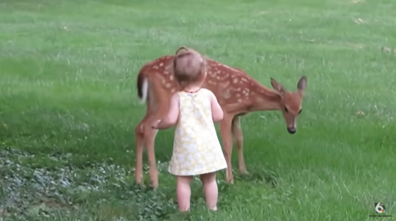 動画冒頭、女の子の赤ちゃんは芝生の上にいる小鹿を見つけ、興味津々のようで少しづつ近づいていきます。