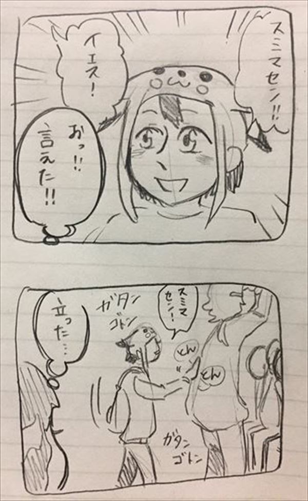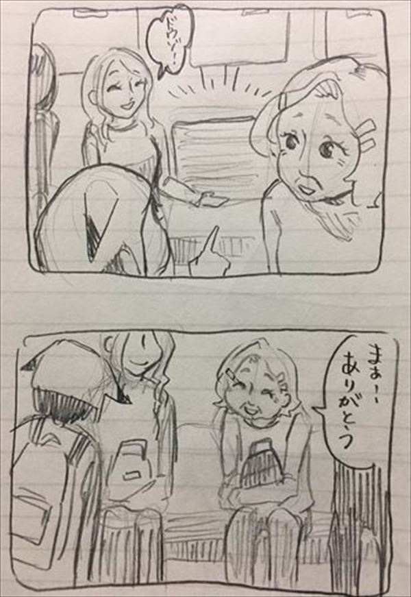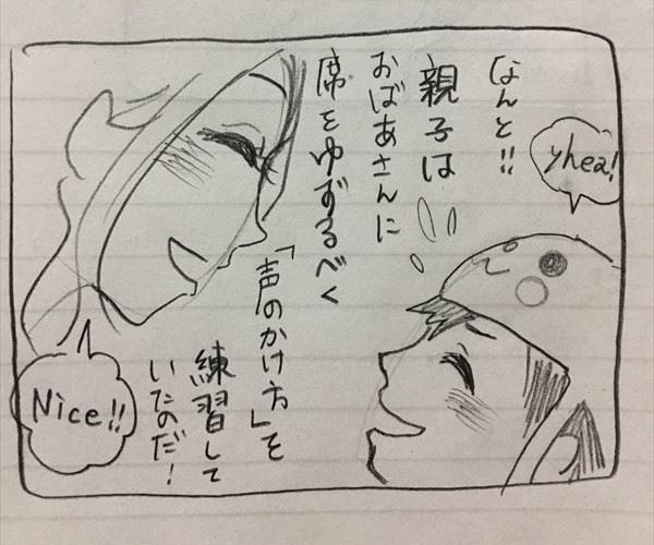 なんて心の優しい少年なの~!おばあさんに席を譲るために、一生懸命「スミマセン」を練習していたとは!
