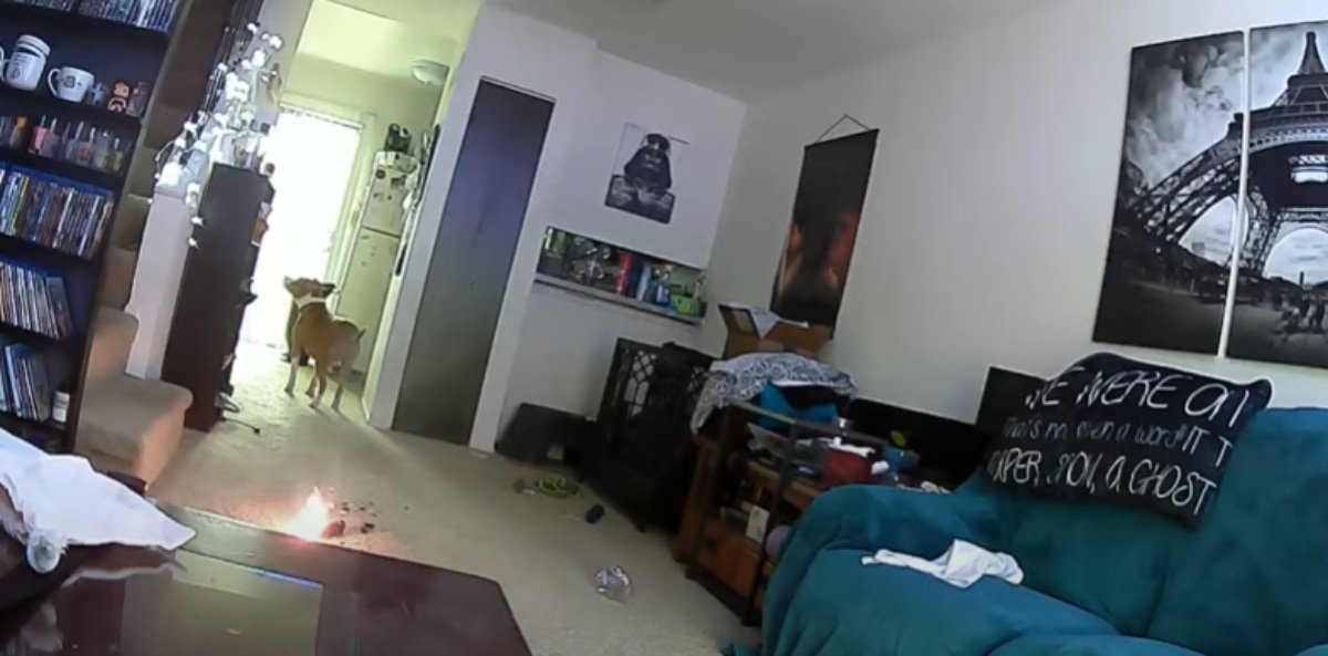 出火した瞬間、レアともう1匹のピットブルが驚いて逃げ回っていますね。