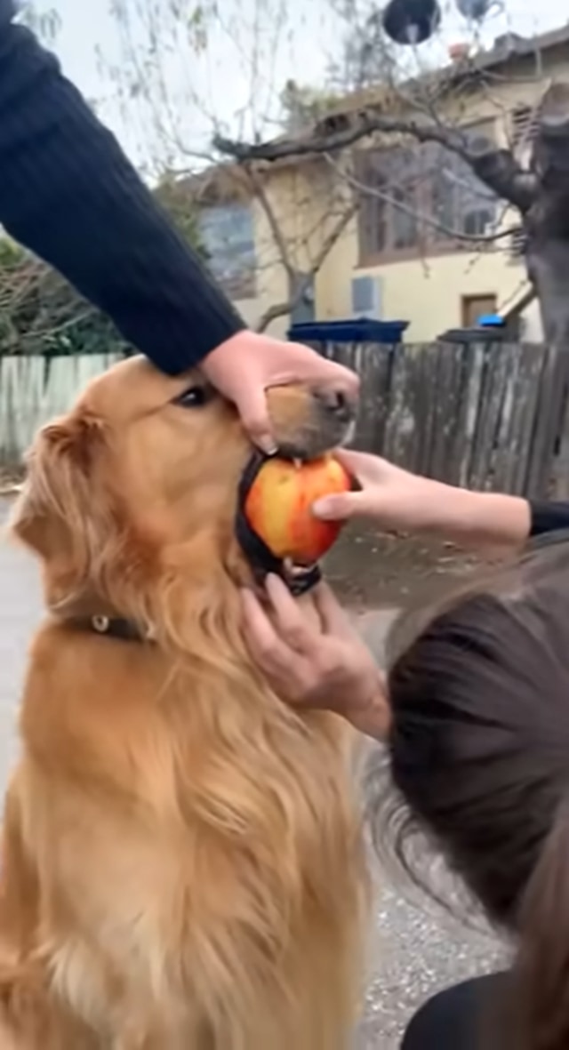 どうやらサム君は散歩中にいたずらで近所に転がっていたリンゴを咥えてしまったようです!