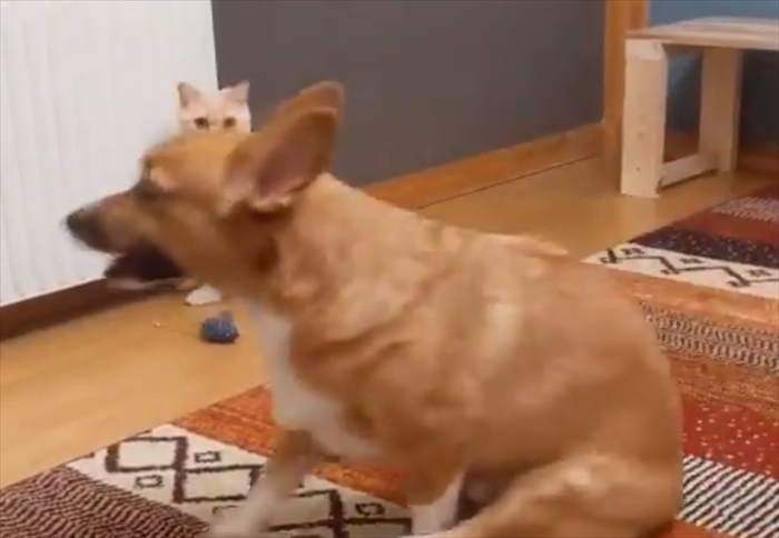 今回話題となっているのは、まるでロボット掃除機の“ルンバ”のように動くワンコを目撃し、戸惑いを隠せないニャンコの表情。唖然としながらも可愛らしい表情は必見です!
