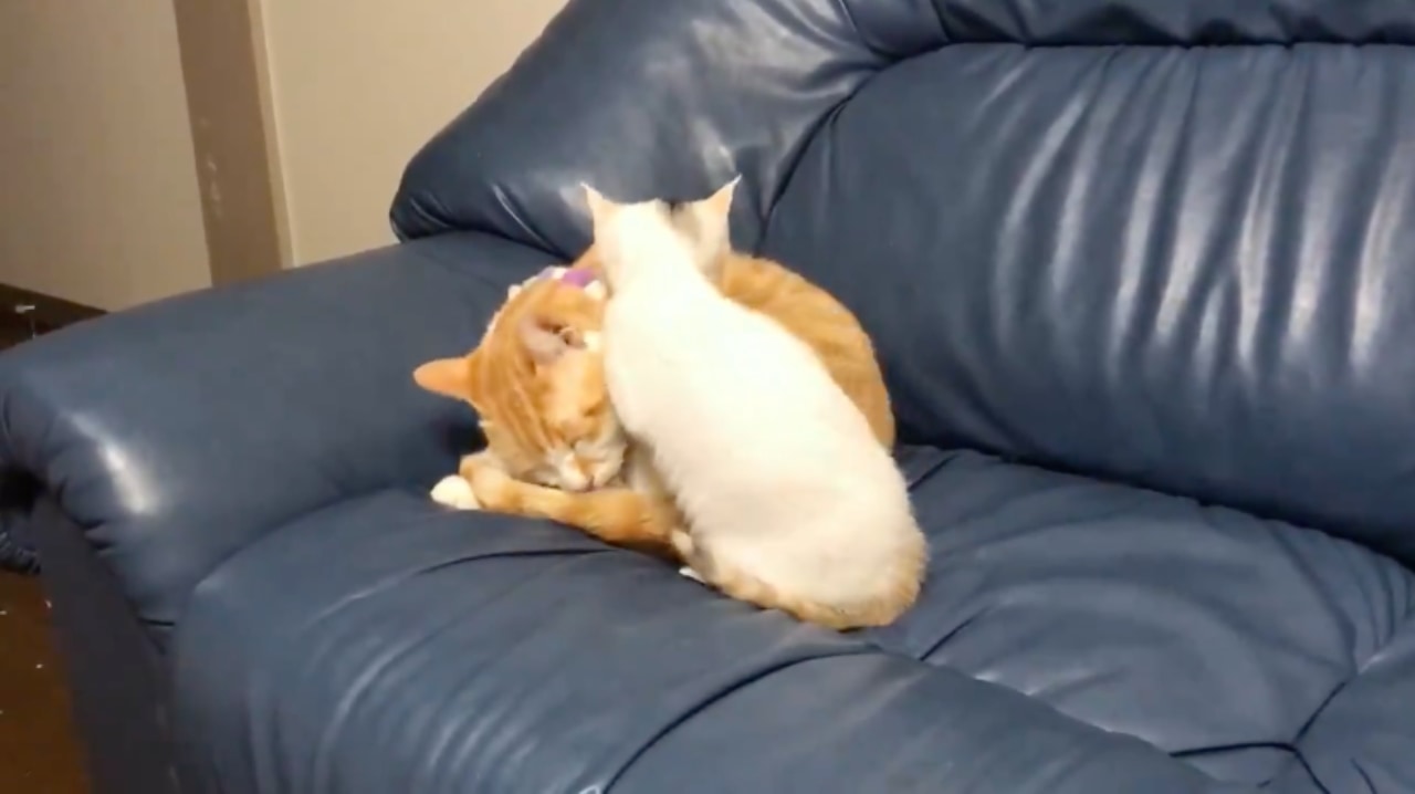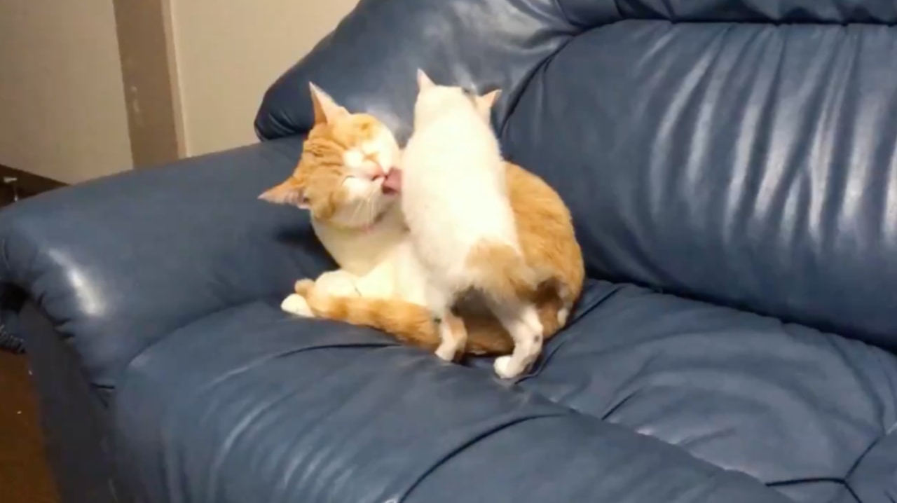 「そうか、おいでおいで」と受け入れるように、キキちゃんを毛づくろいしてあげます。