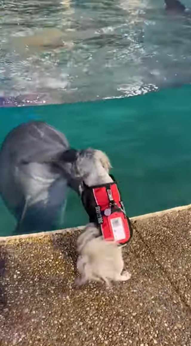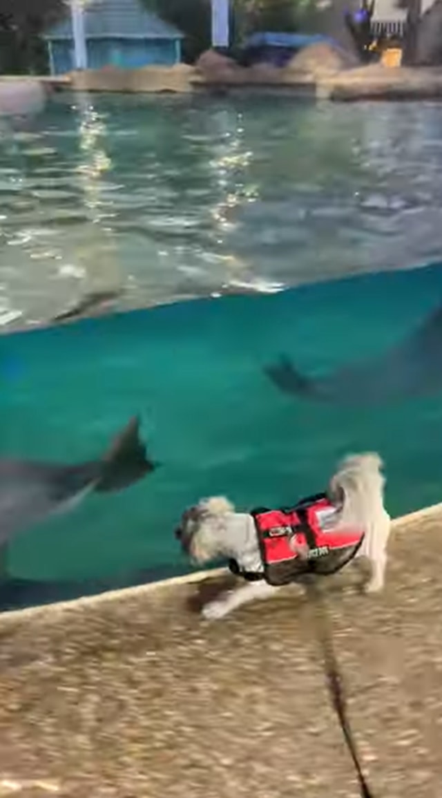 この水族館はペットの観覧もできる施設のようで、動画の撮影者はまだ幼いシーズーを連れてイルカの水槽近くに来たようです。