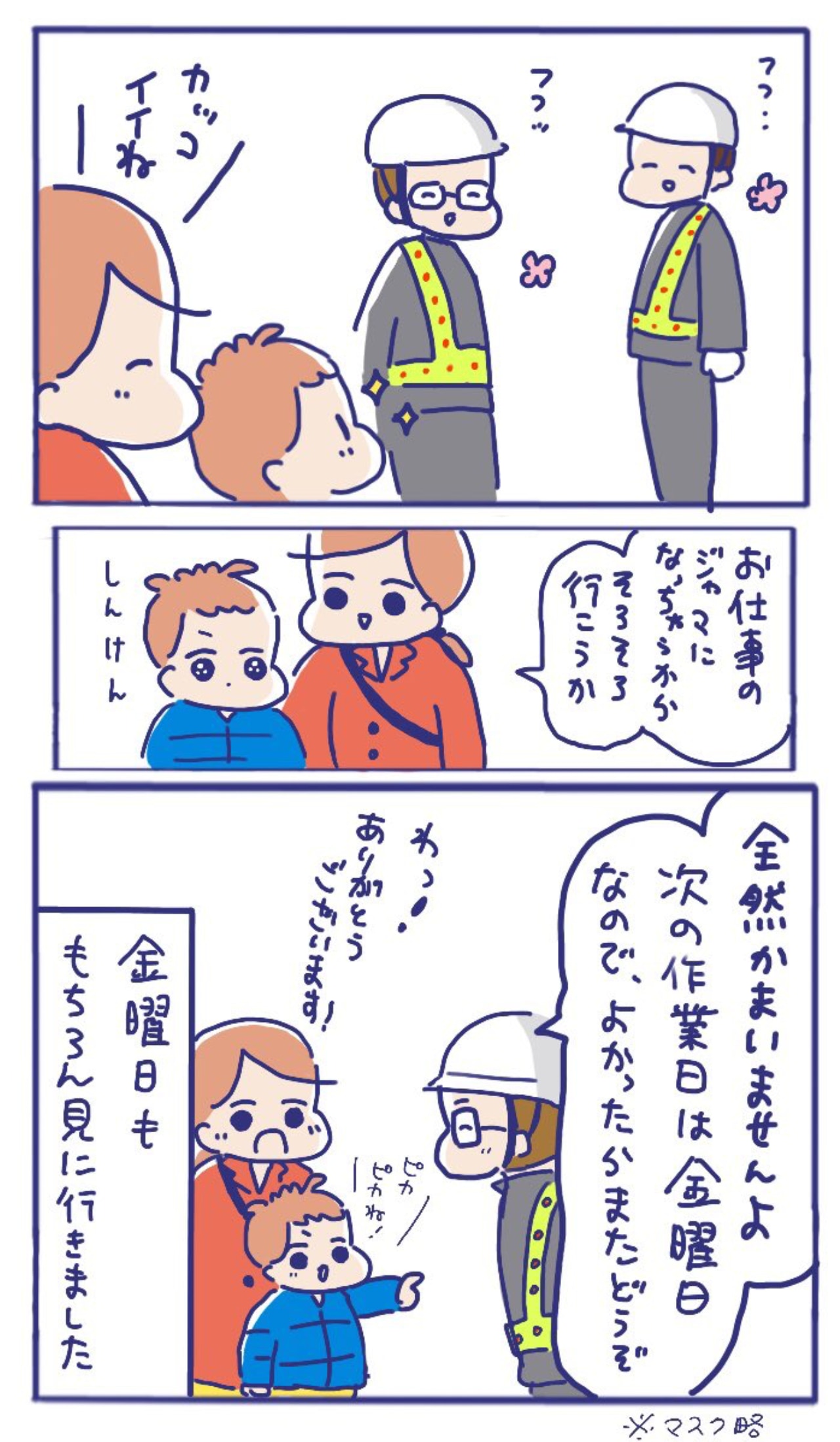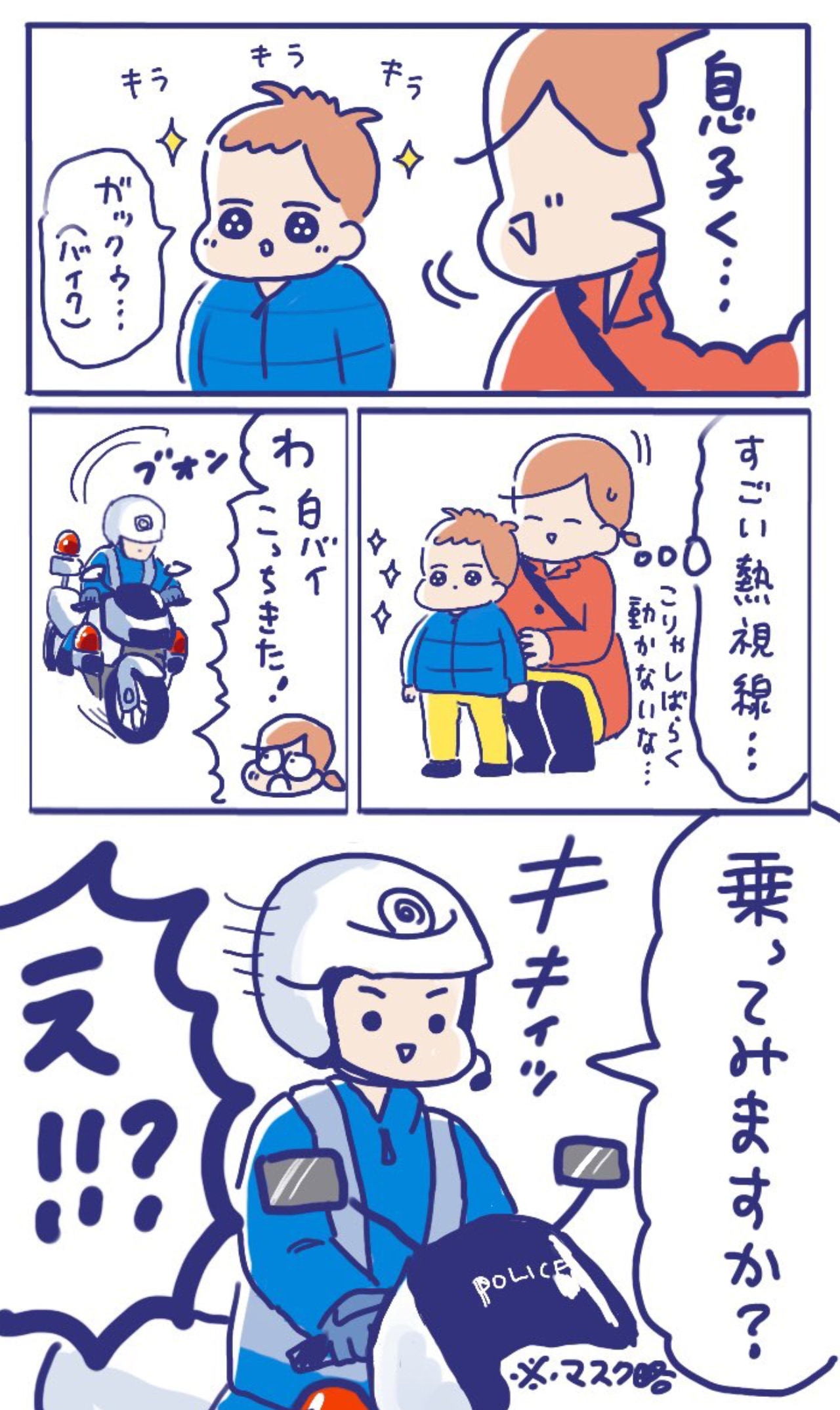 働く車に乗るカックイ~大人の人たちを見てキラキラと目を輝かせる息子さん。そんな息子さんの「大好き」な気持ちを汲んでバイクに乗せてくれたり、作業の見学を歓迎してくれたり、車から手を振ってくれた方々。