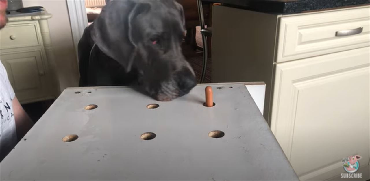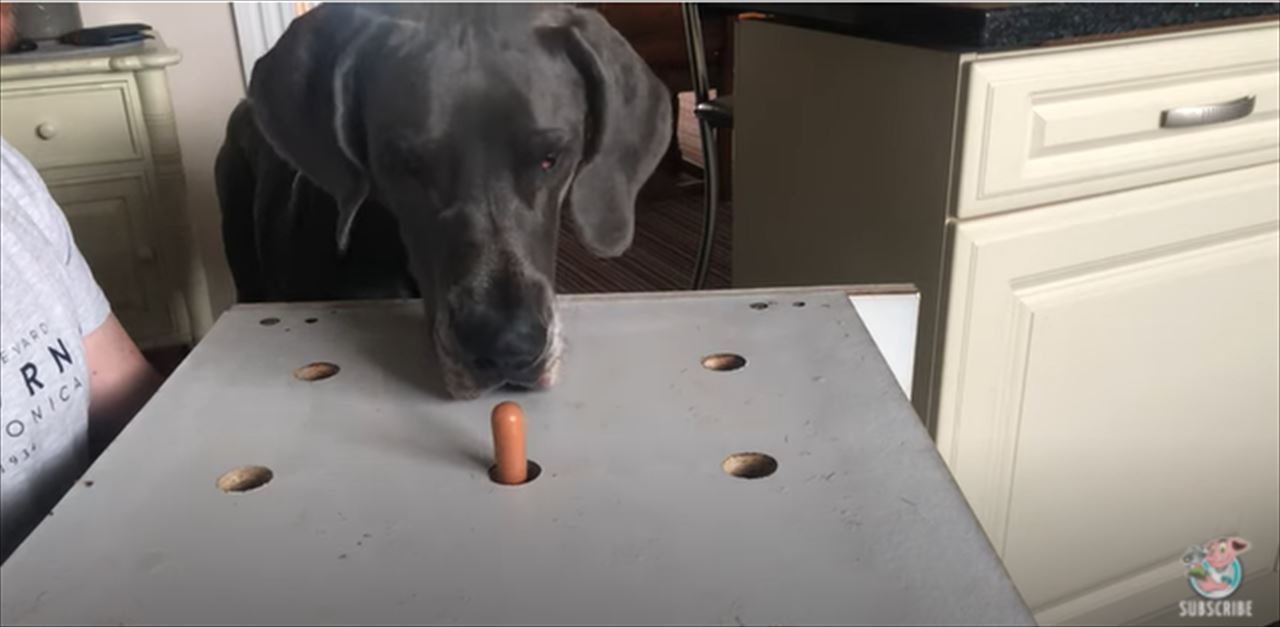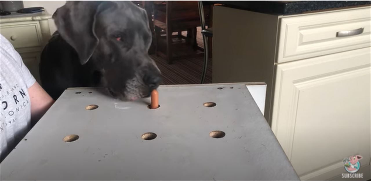 飼い主さんは古いキッチンキャビネットからホットドッグスタンドを出して「もぐら叩き」ゲームをすることに。たくさんの穴からソーセージが1つ出てくるようですがいったいどの穴から出てくるのでしょうか?あ、ソーセージが出てきたよ!