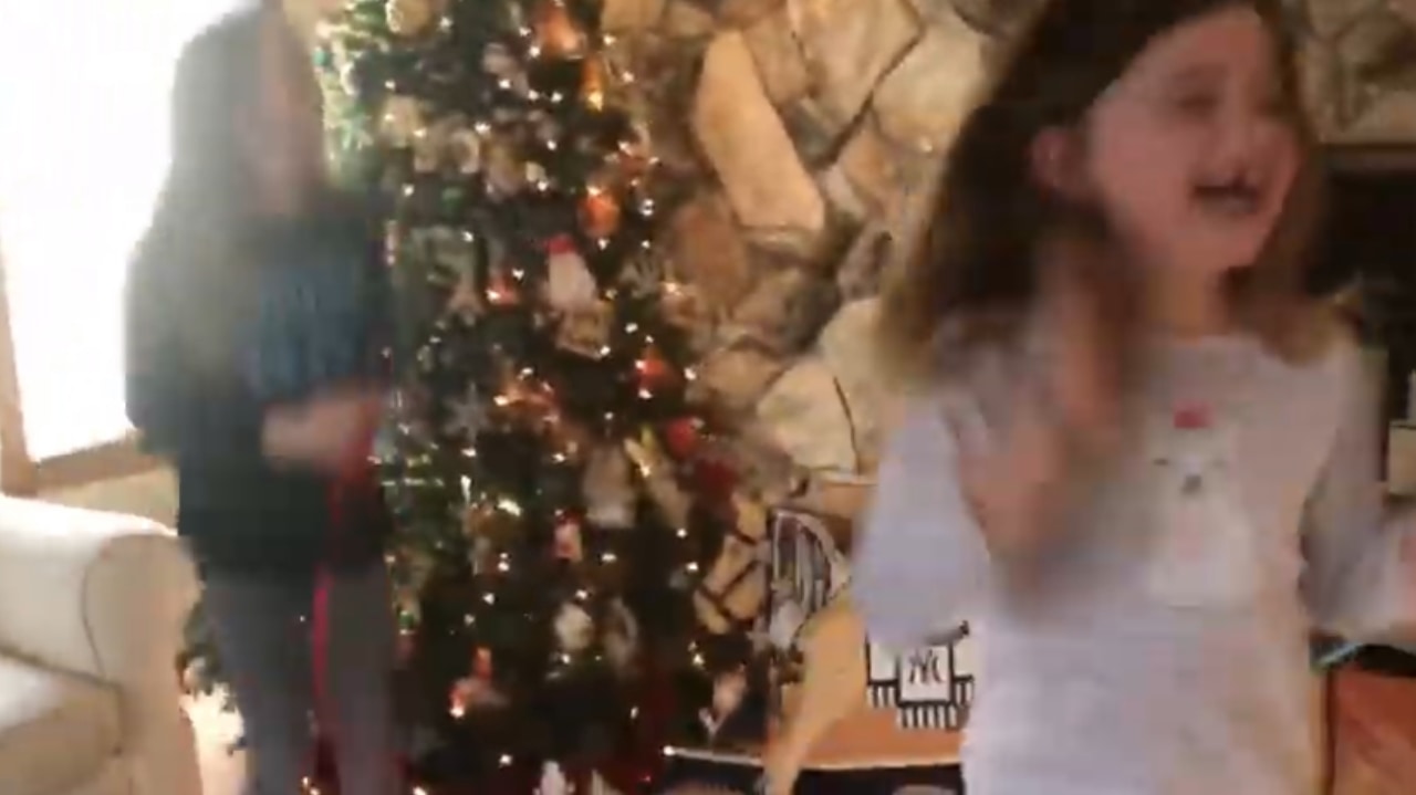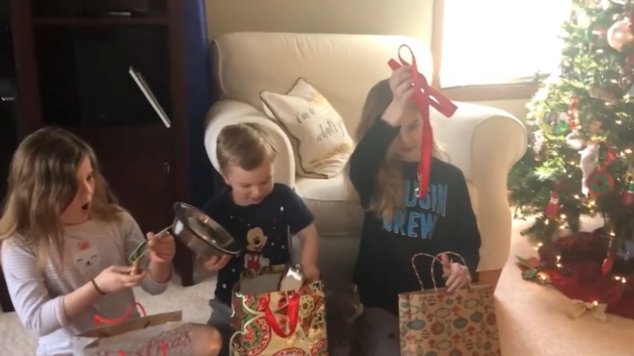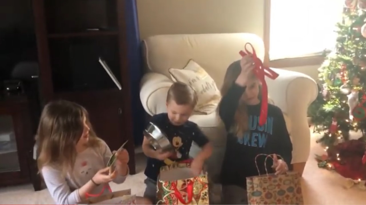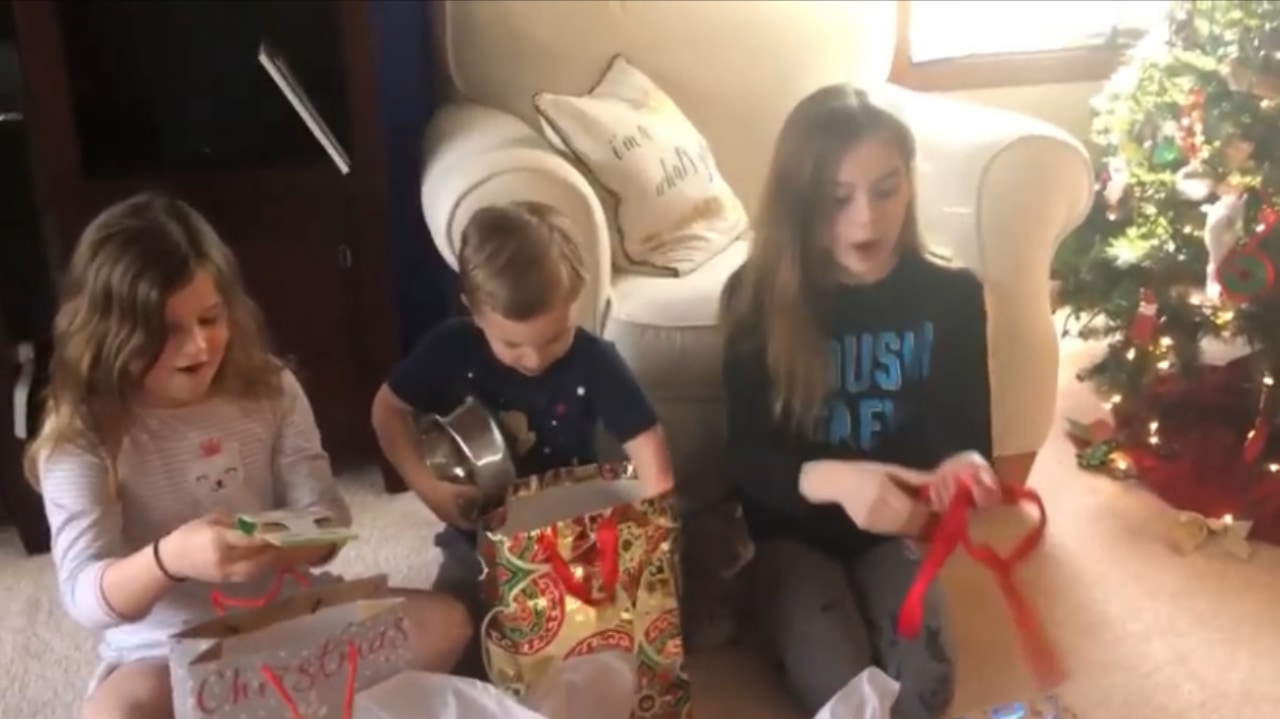 サプライズが決行されたのは昨年12月29日。クリスマスツリーの横に仲良く並んで座っている3姉弟の前にはプレゼントが入った紙袋が3人分置かれています。