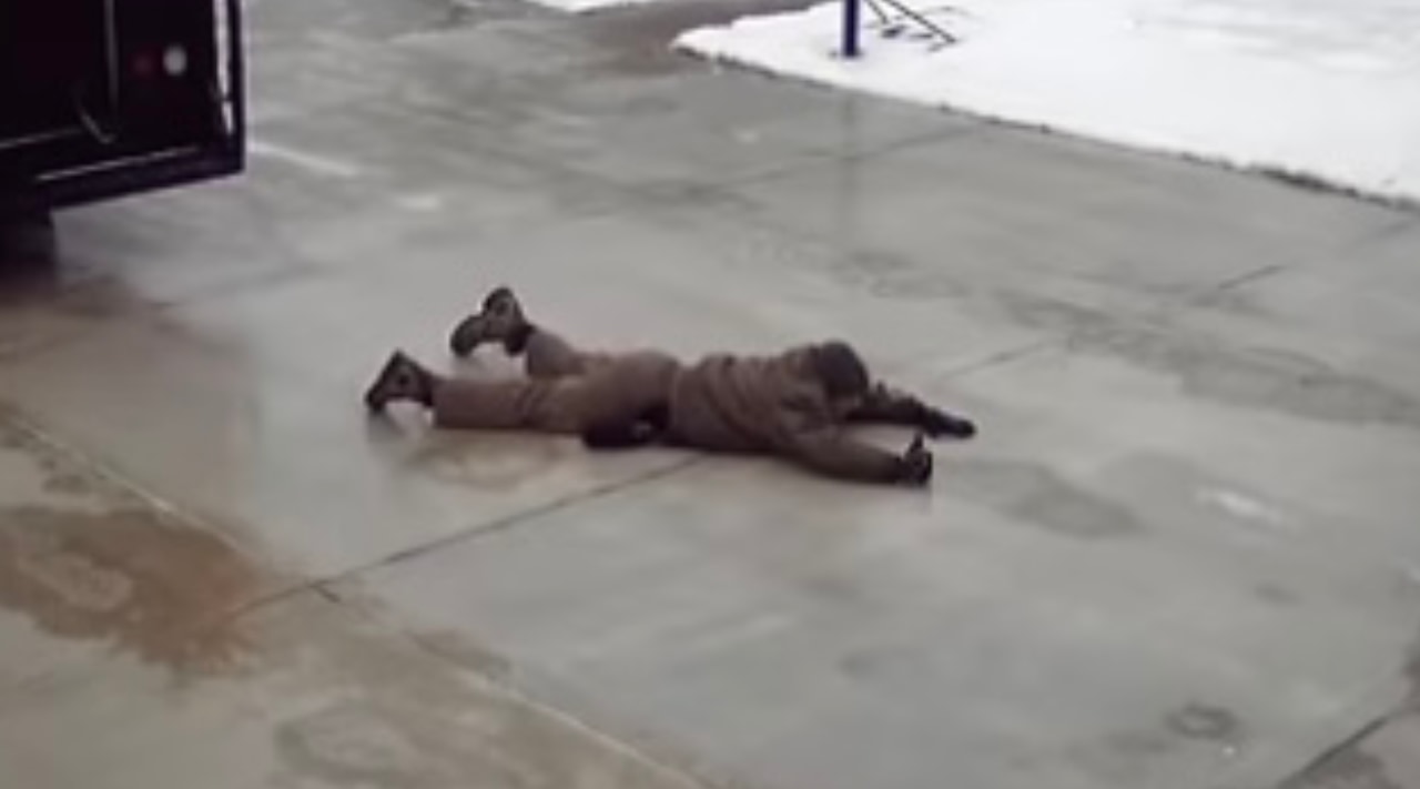 宅配荷物を届けにやって来たのに、受取人のもとに近づくことができないドライバーの男性。なぜなら地面が凍っていてツルツル滑り、立つことすらままならない状況だったのです。
