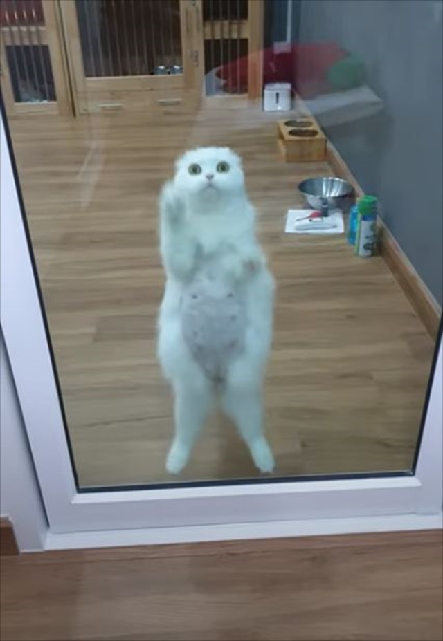 なかなかドアを開けてくれない飼い主さんにさらなるアピールをしようと、「早く気づいてニャ!」と言わんばかりにジャンプをし始めます。こ、これは早く開けてあげないと・・・!