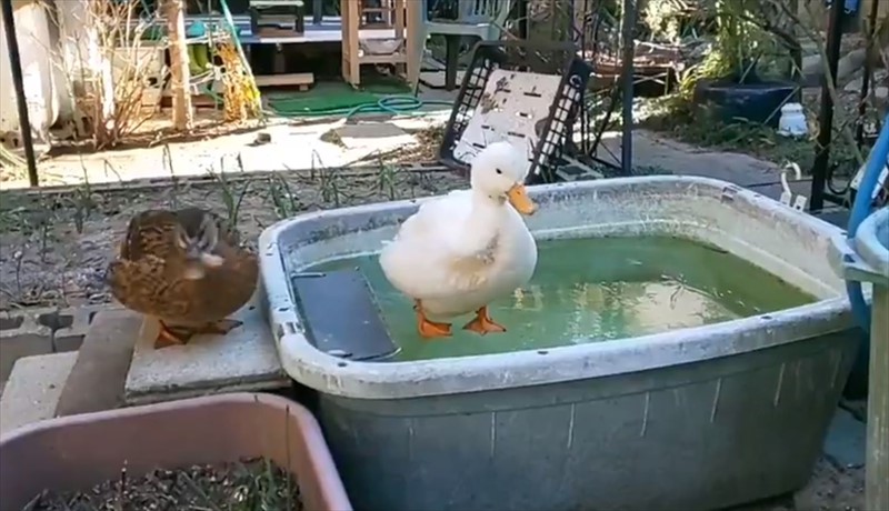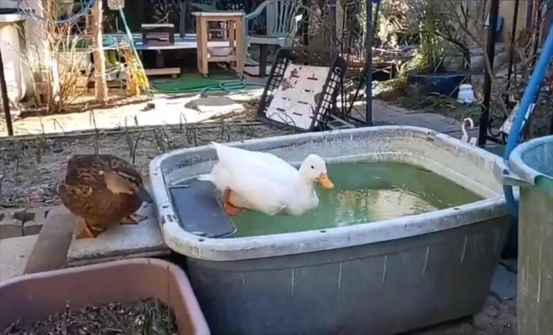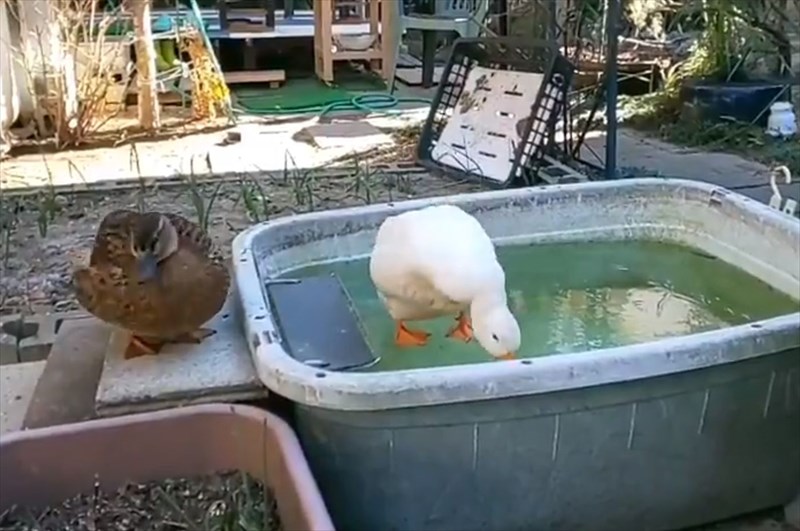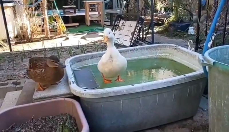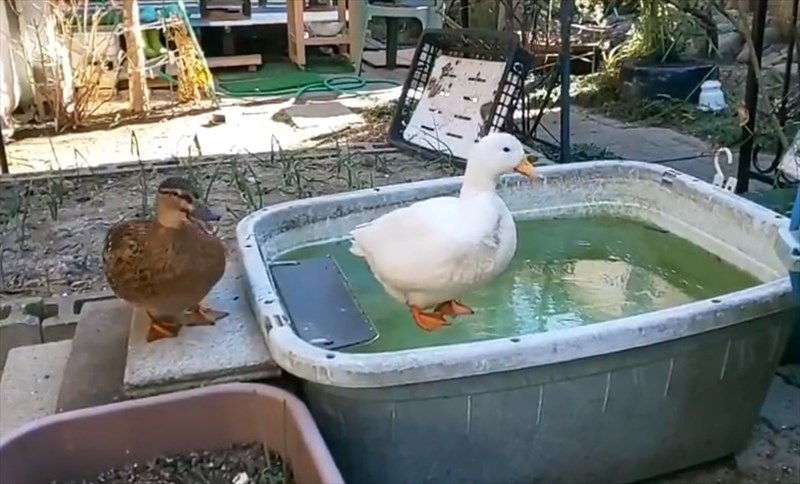 容器に入った水に入ろうとしているのは、世界最小のアヒル(アヒルと比べると4分の1の大きさ)と言われるコールダックの「白ちゃん」。水の中に入ろうとしています。