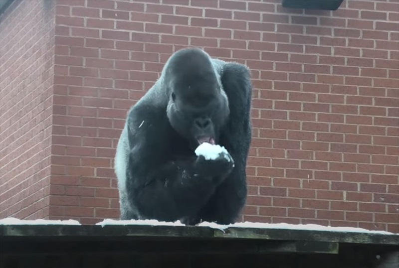 屋根の上に移動した後、オウンビが手に取ったのは、なんと「雪」!大きな手でがっつりつかんで口にもっていきます。