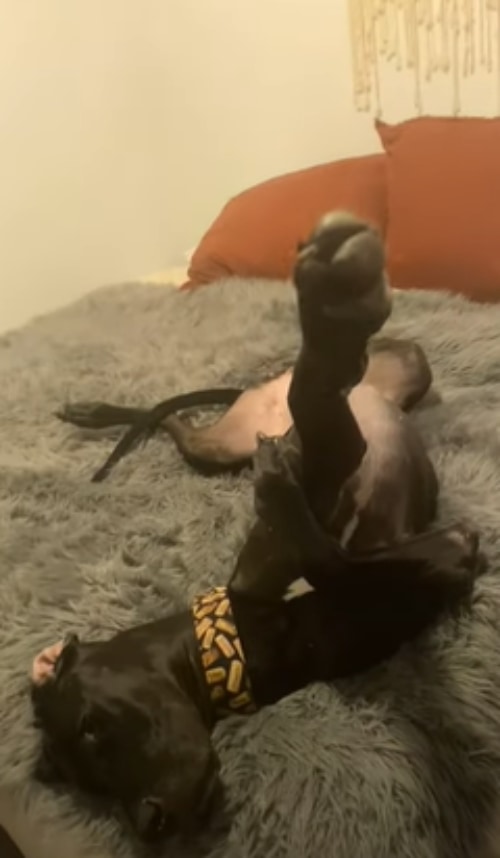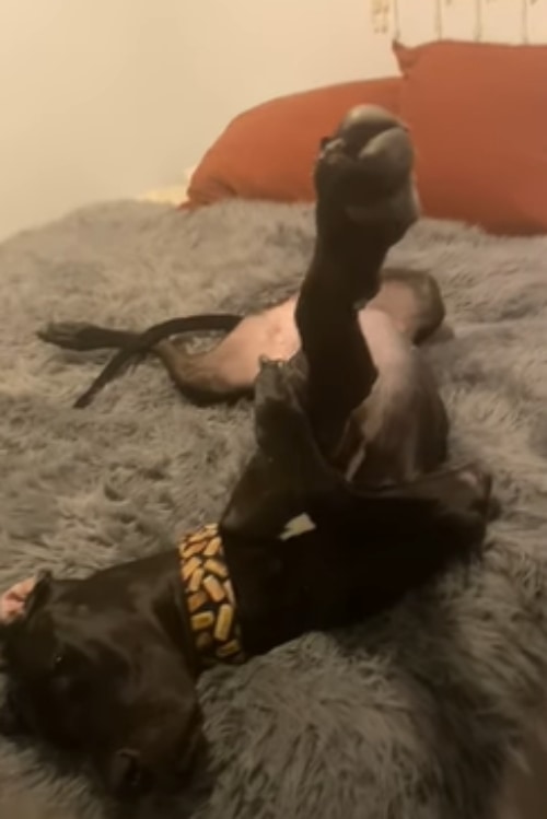 飼い主さんが寝室に行くと、グレートデーン犬のレモンが、何やらベッドの上で寝ているようです。