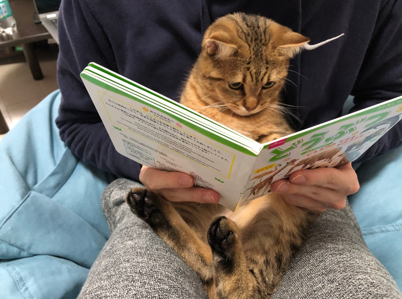 そんなみにらくん、今度は飼い主さんの膝にお座りしてどうぶつの絵本を真剣に読む姿が可愛すぎると注目を集めています!
