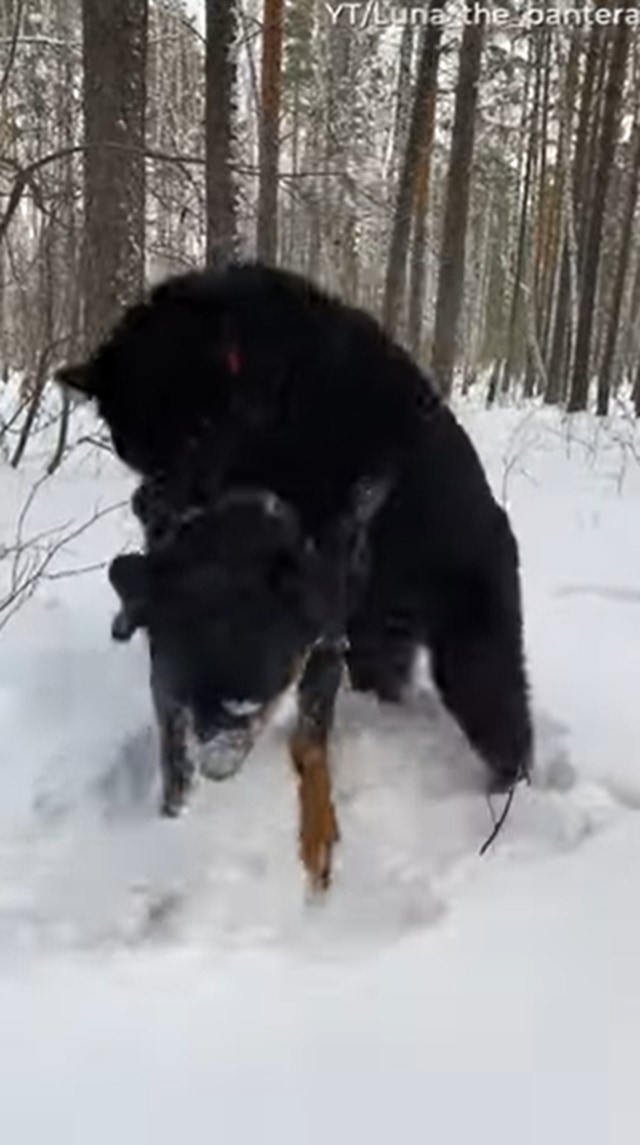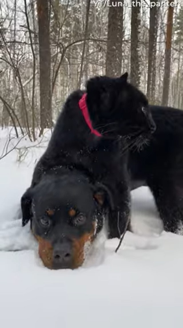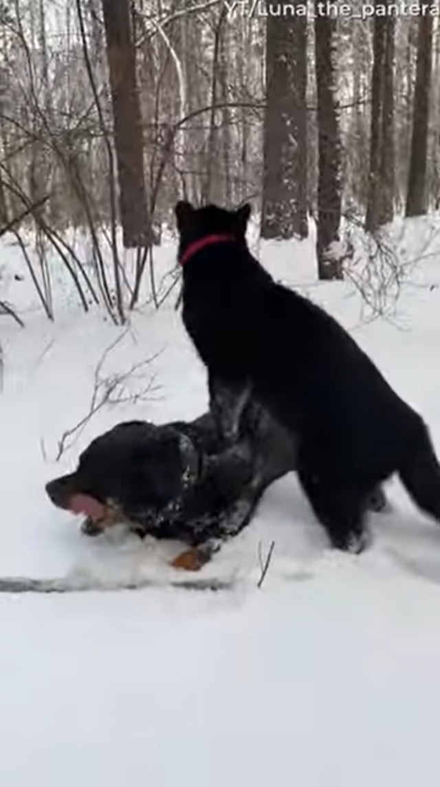 映像の仲でワンコが戯れているのはなんと... 黒ヒョウ!?