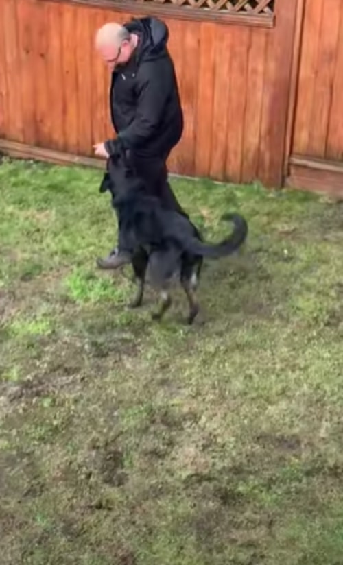 すかさず飼い主さんの方へと走って行き、「だめー!!」と言わんばかりの勢いで穴を死守するため飼い主さんの足を噛み噛み、穴が埋まるのを阻止しようとしています。