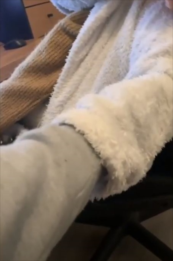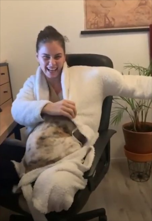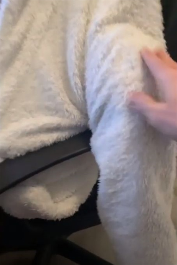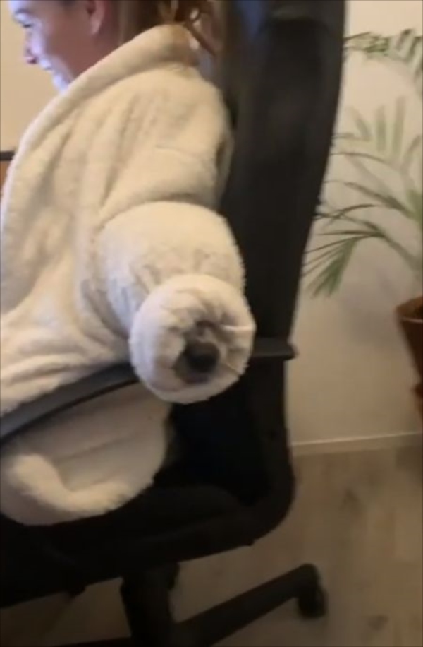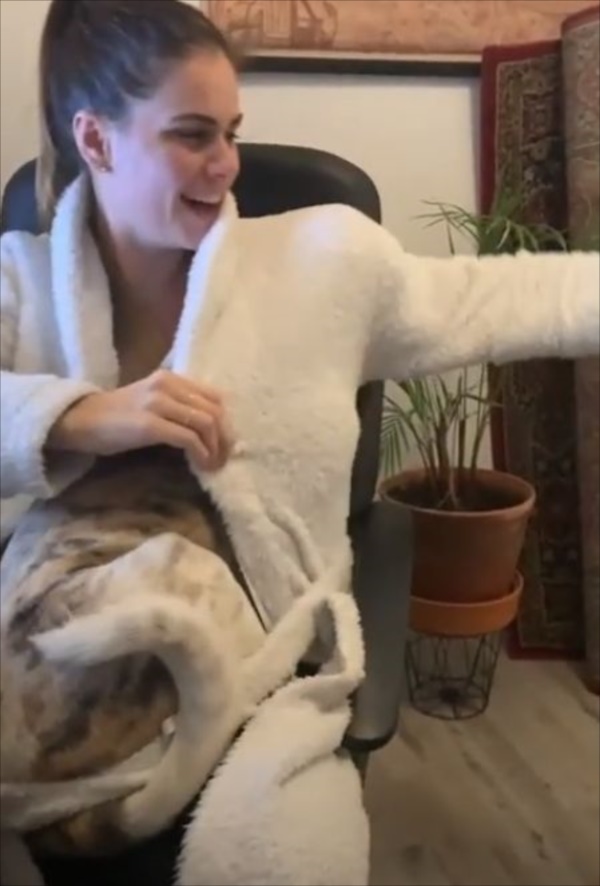 そんなワンコが目をつけたのは、女性が着ていたふわふわのガウン。颯爽と潜り込んだのは予想通りですが、その後に予想できないことをし始めたのです(笑)