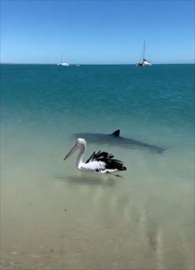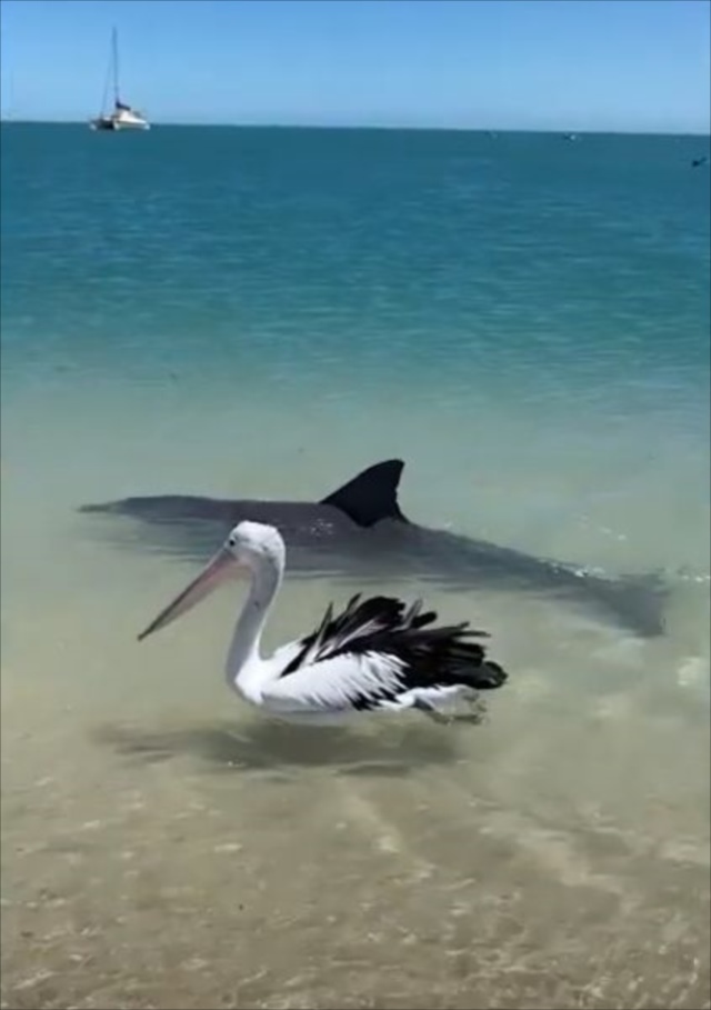 イルカとペリカンが一緒に泳ぐという一見すると平和な光景ですが、どうやら内情は違っていた!?ようです。