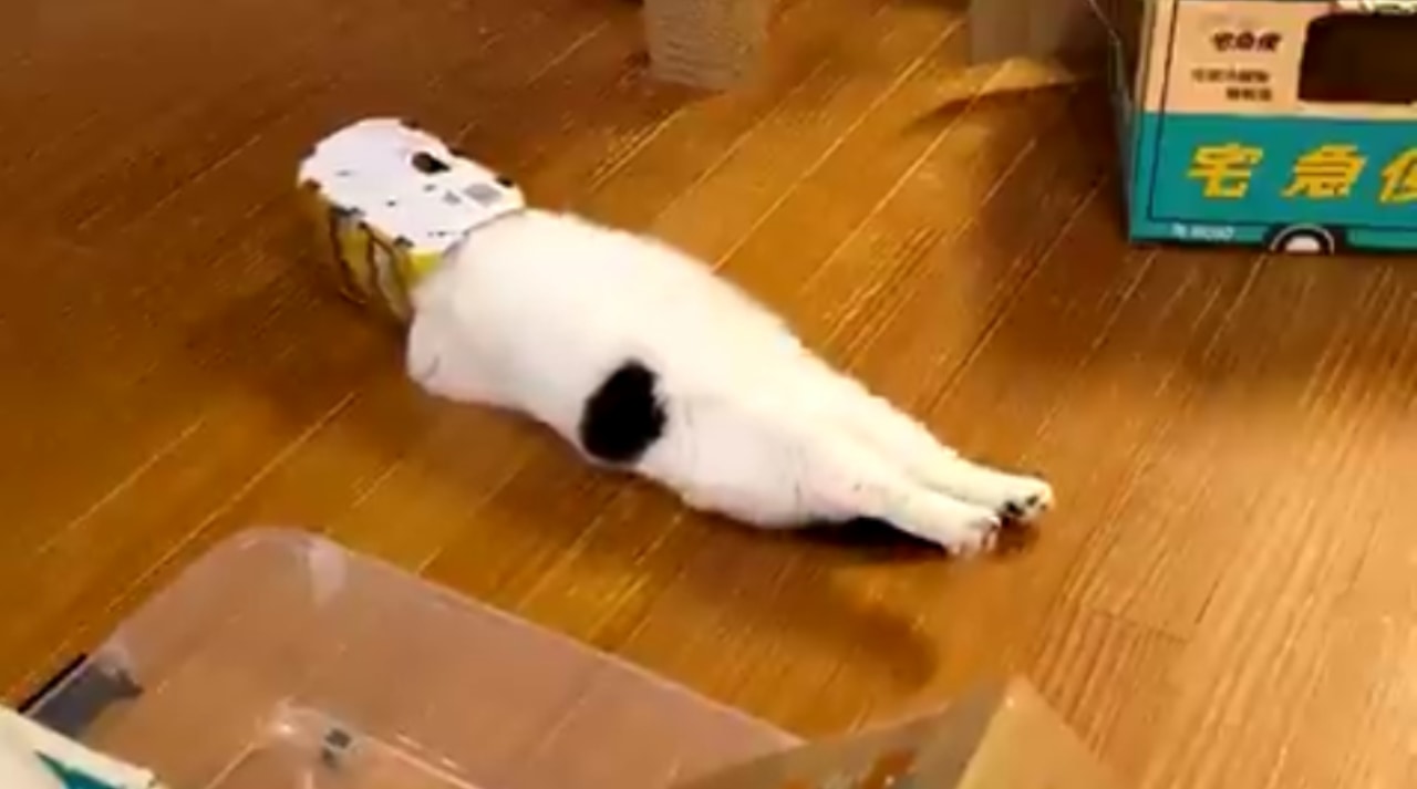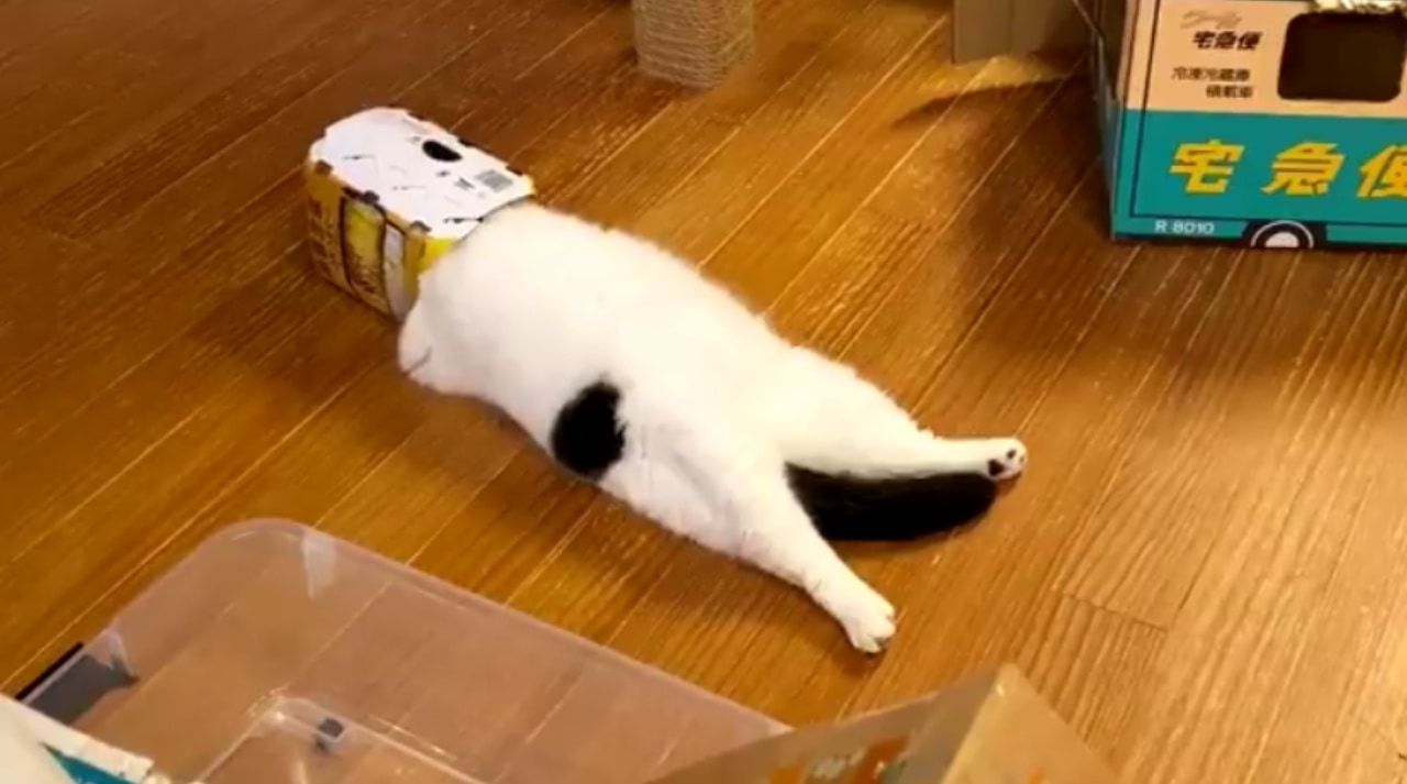 空き箱に顔を入れ、ヘソ天で寝転ぶ丸之助くん。