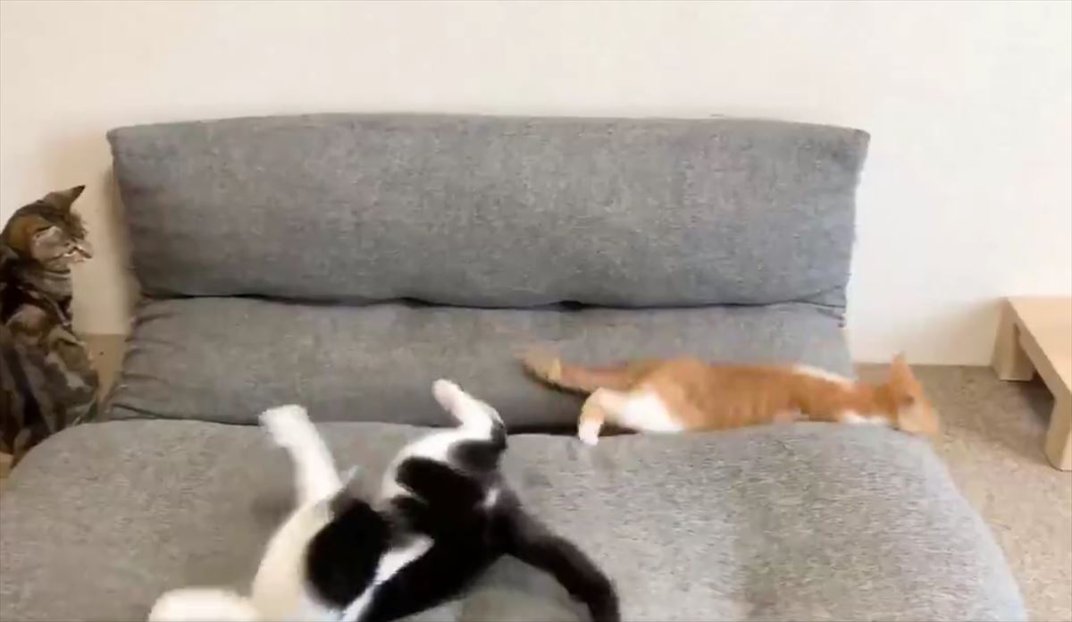 ハチワレの猫パンチを茶トラが華麗なジャンプでヒラリとかわし、ソファーの背もたれを利用し三角跳び!