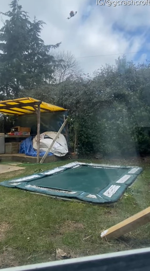 ジョージさんが窓を開けてあげると、ドローン君は庭先のトランポリンに一直線!