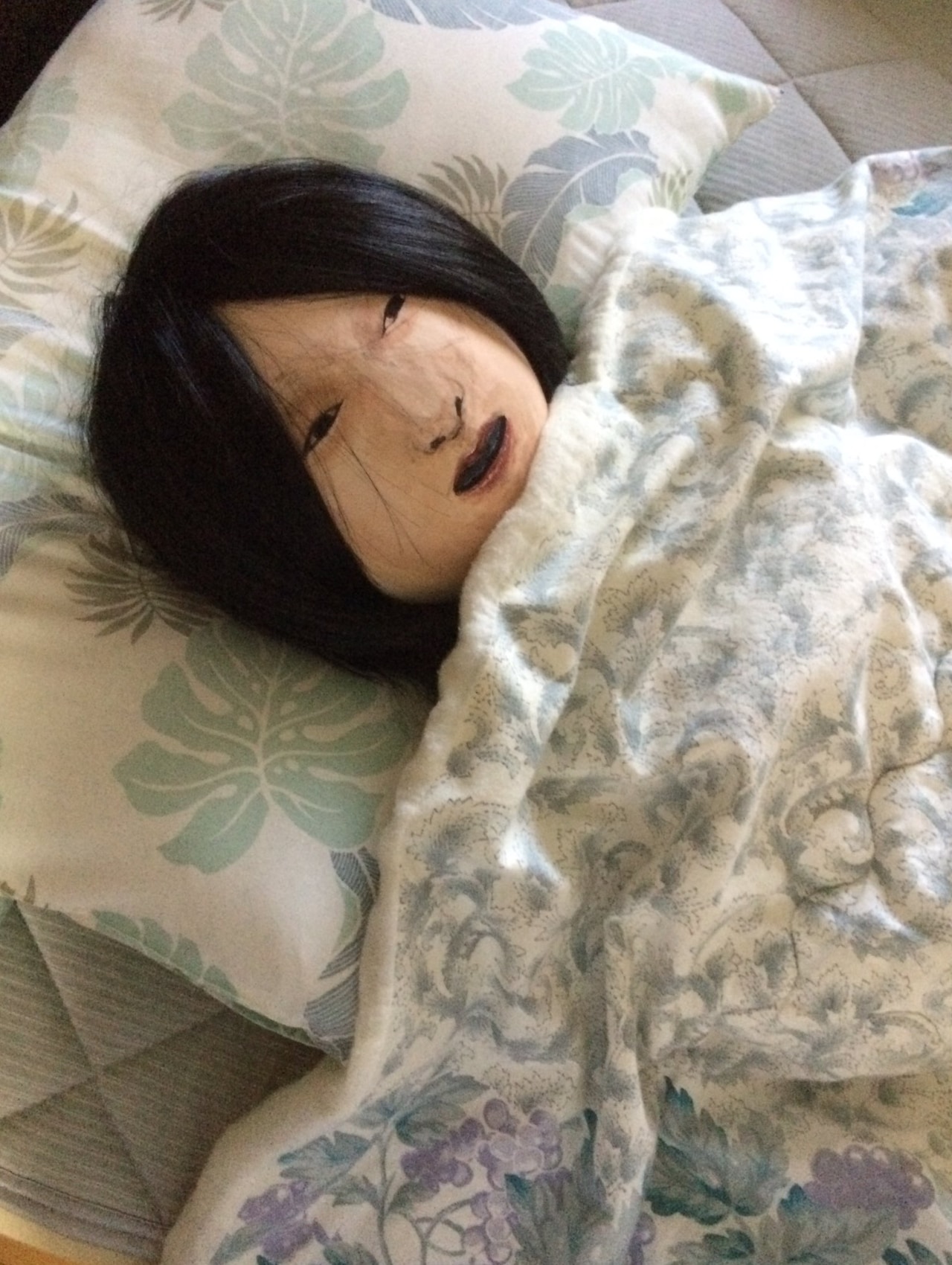 感情が全く読み取れない能面のような顔がなんとも不気味で、嫌な想像を掻き立てますよね。パーツの立体感もしっかりと表現されていて、ウィッグを装着した姿は生々しい怖さがあります。