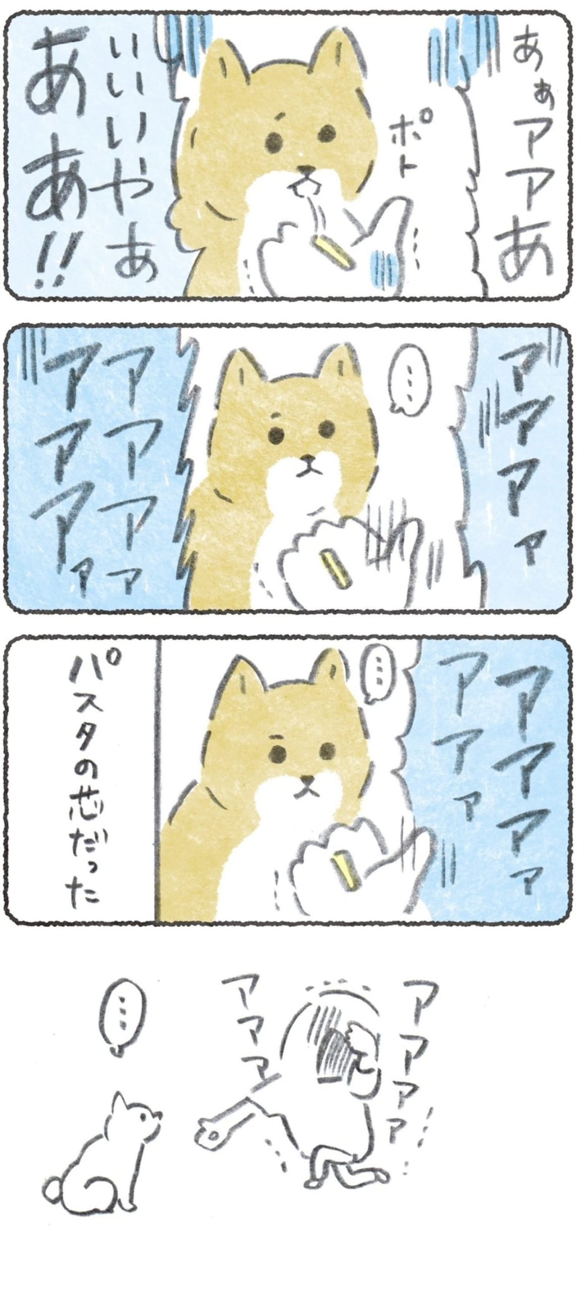 「ちょうだい!!」「イヤーーッ」「イヤだけどちょーだい!!」と焦りや恐怖で葛藤しながら訴えるキリさんに対し、こつぶちゃんが口から出したものは・・・パスタ。
