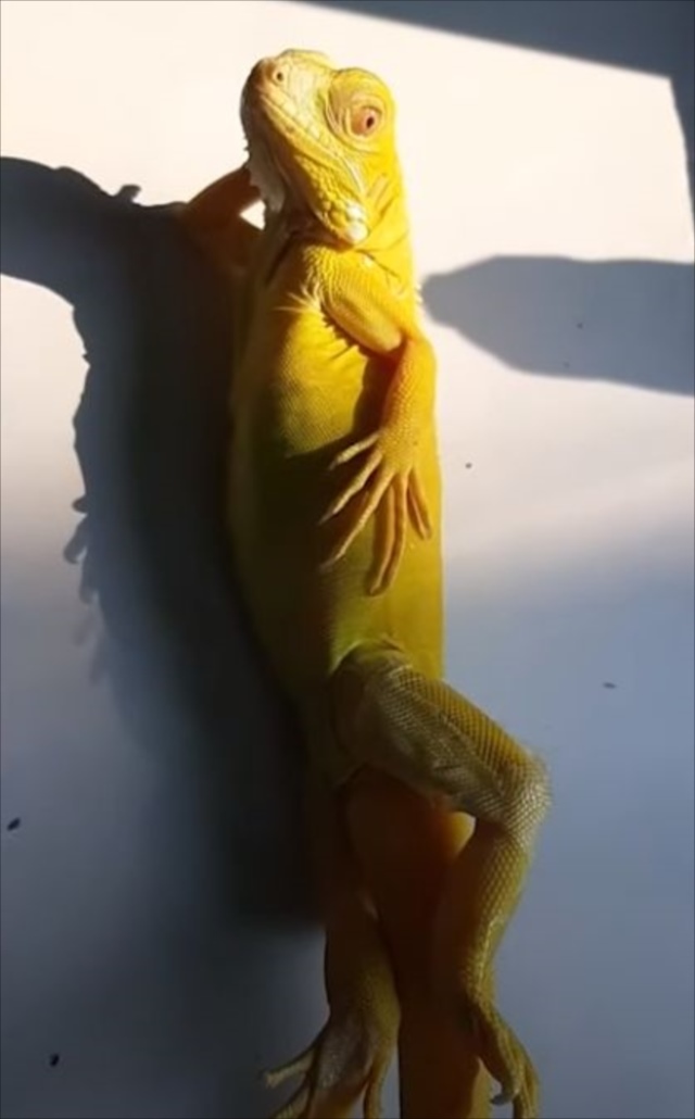 こちらは、タイのチョンブリ県のご家庭で暮らしているイグアナ。まばゆいレモン色が印象的ですが、それ以上に際立っていたのは、そのポージングでした。