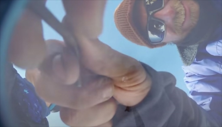 BASの調査員が厚さ900mの棚氷を掘り、カメラを下ろしていきます。