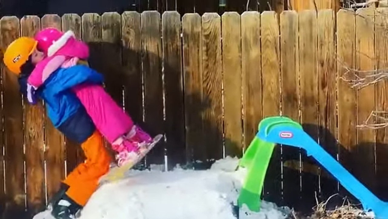 妹ちゃんはどうやらお兄ちゃんの真似っこをして上手にスノーボードを乗りこなしたい様子。