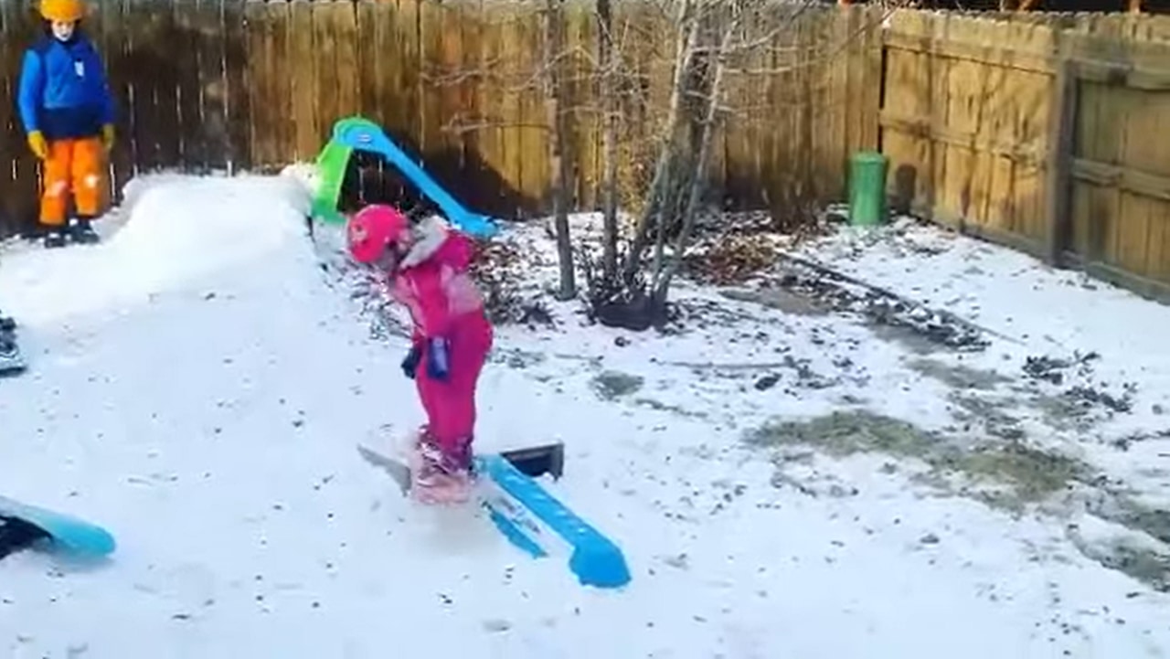 動画はとあるお家の庭に振った雪をかき集めて作られた小さな雪山にて。