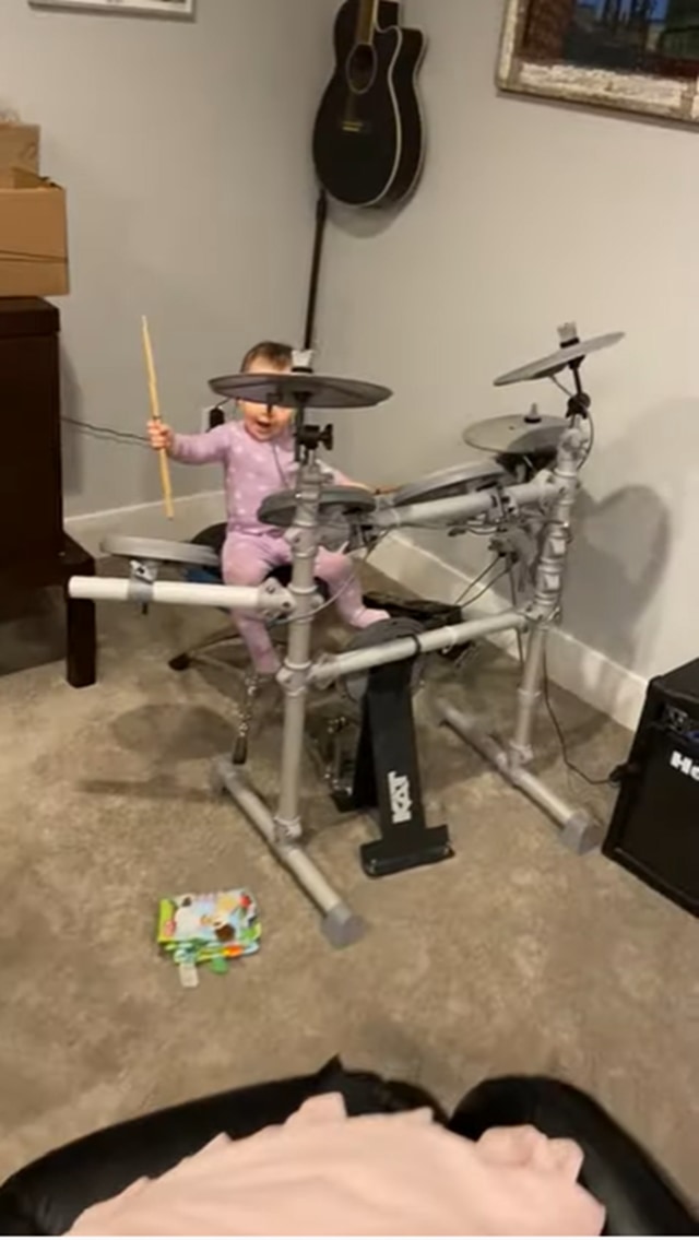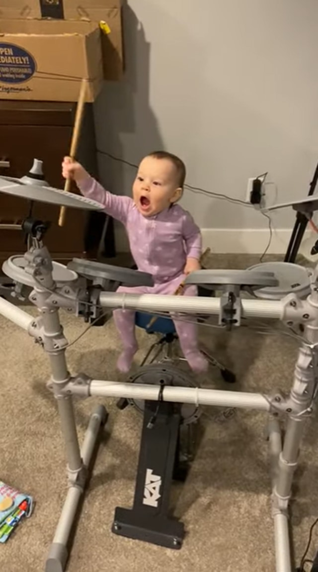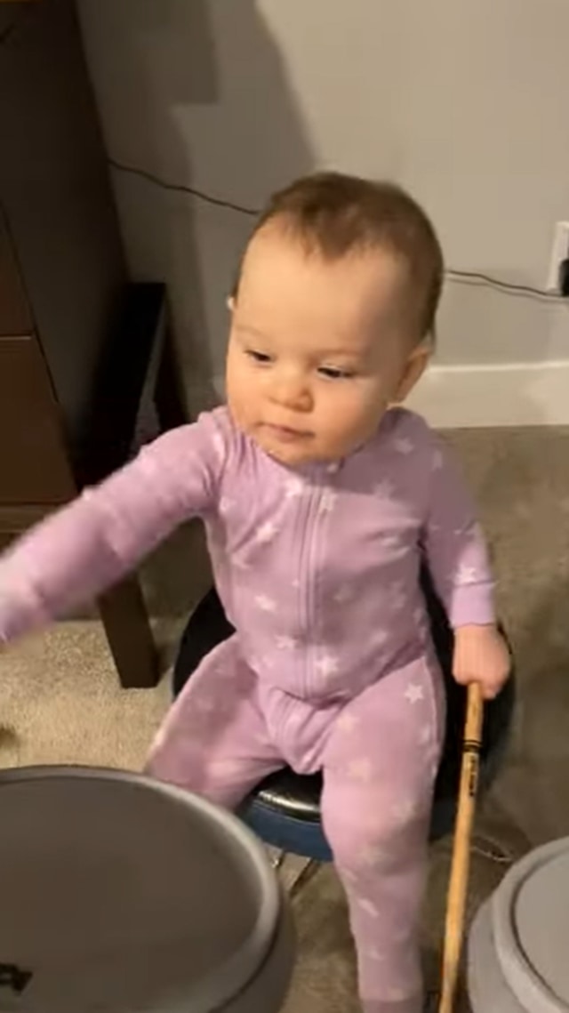 まだ1歳程度と思われる赤ちゃんが器用にスティックを握ってドラムを叩いています!