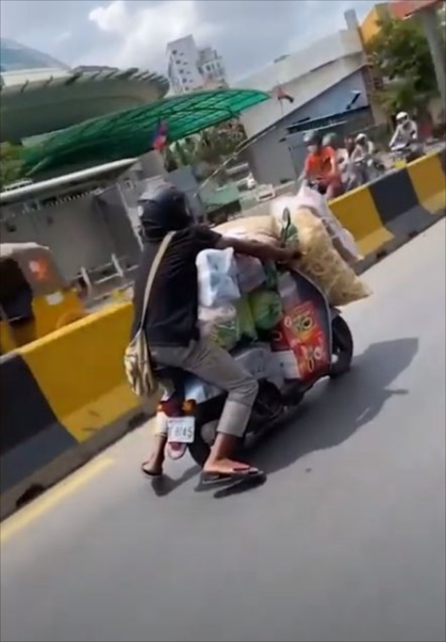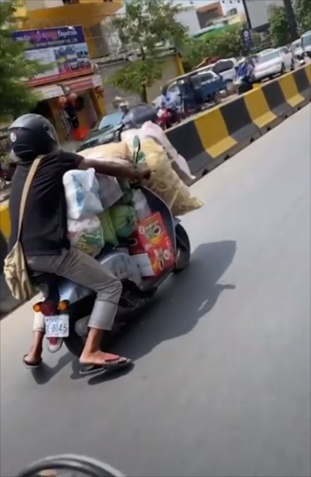 明らかに荷物を載せすぎなバイクが目撃されたのは、カンボジア・トボンクムン州。目の前を走っていたのは、手を伸ばし、足をぶら下げてバイクに乗っている男性。本来自分が乗る位置に大量の荷物を載せ、自身は後部座席の端っこに座っています・・・!