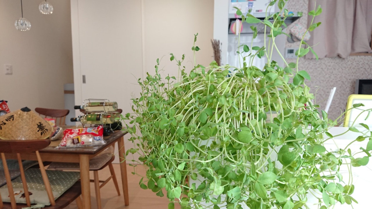 刈られることなくグングンと成長し続けた結果、自分の体重を支え切れなくなってしまったのでしょうか。下向きに垂れた姿は、本来の雰囲気をすっかり失って観葉植物と化しています。驚きもですが、豆苗がお洒落に変身という意外性が面白くて笑っちゃいました。