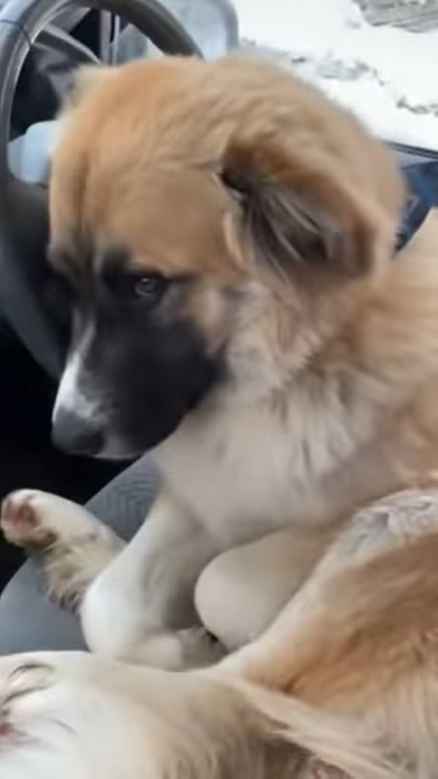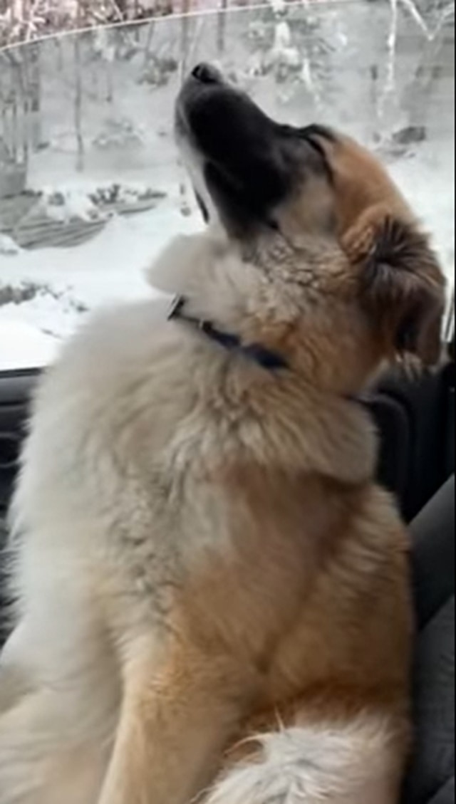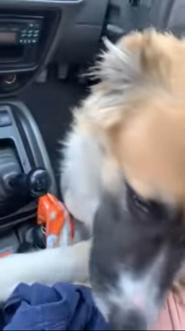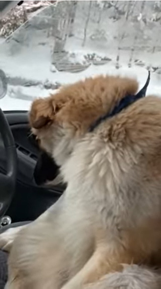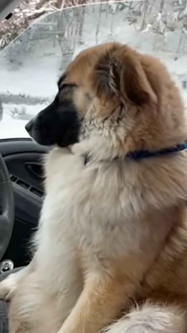 どうやら飼い主さんと車でお出かけした先で、助手席に乗る撮影者さんと一緒に車の中でお留守番をしているようなのですが...