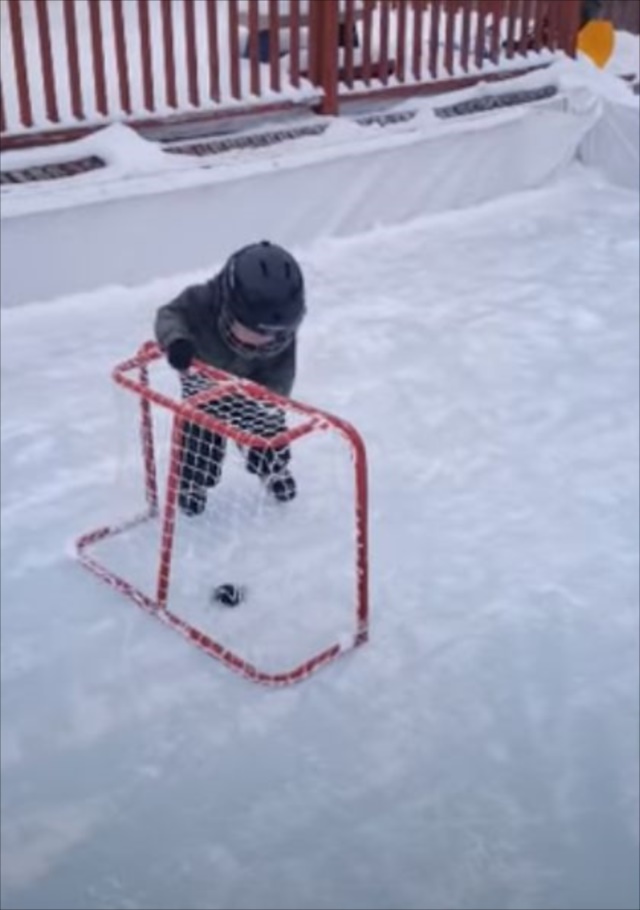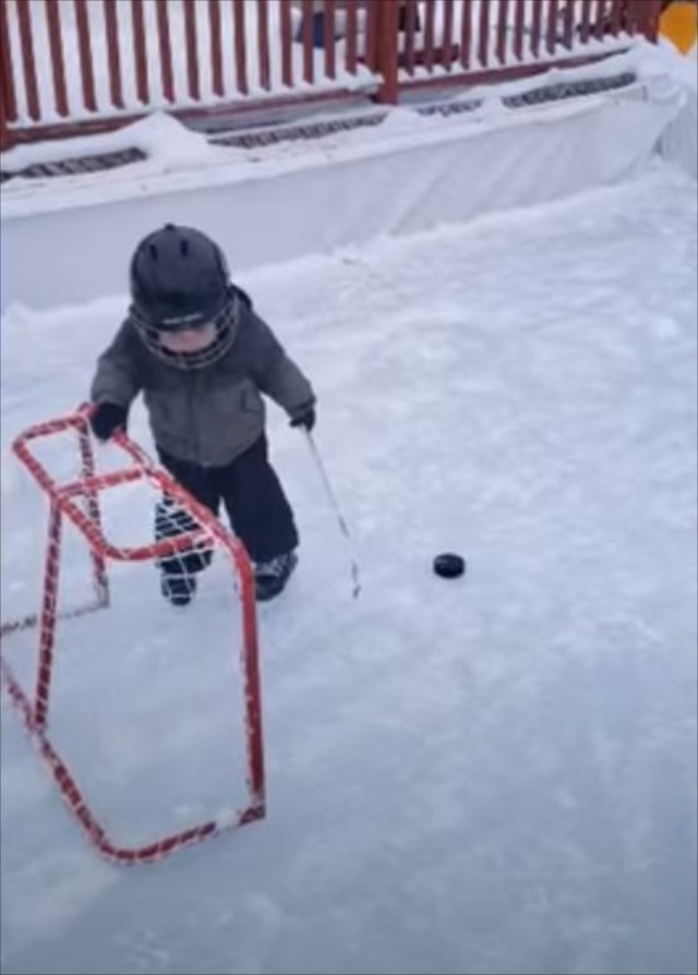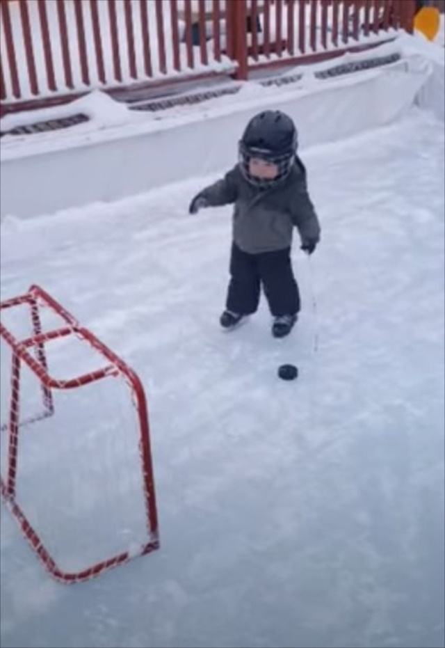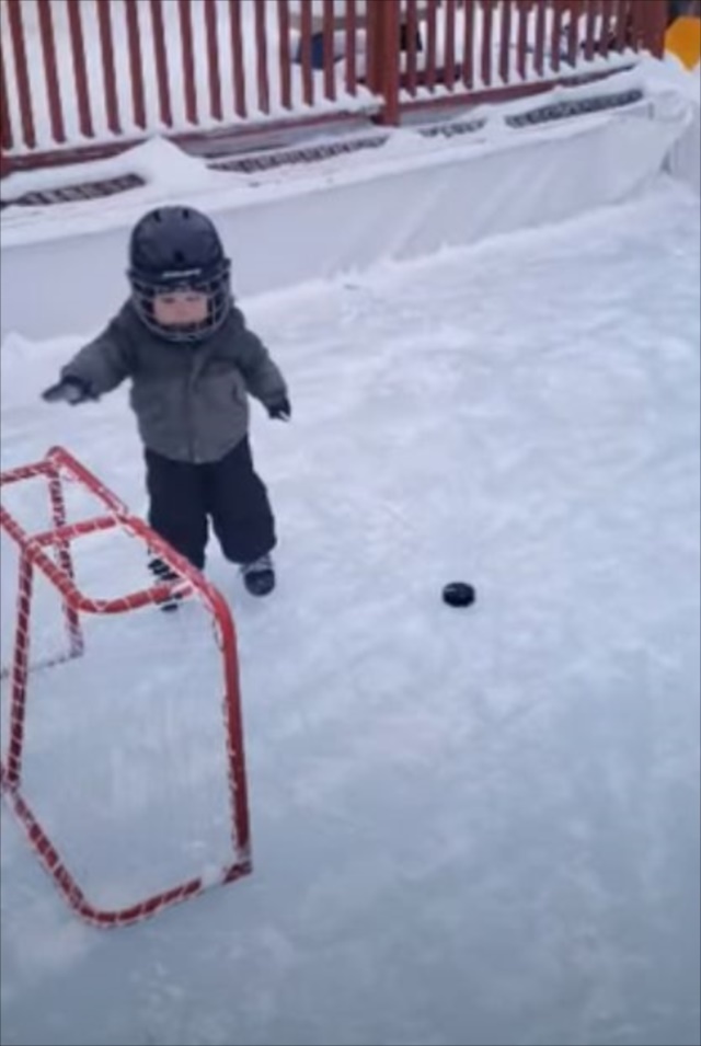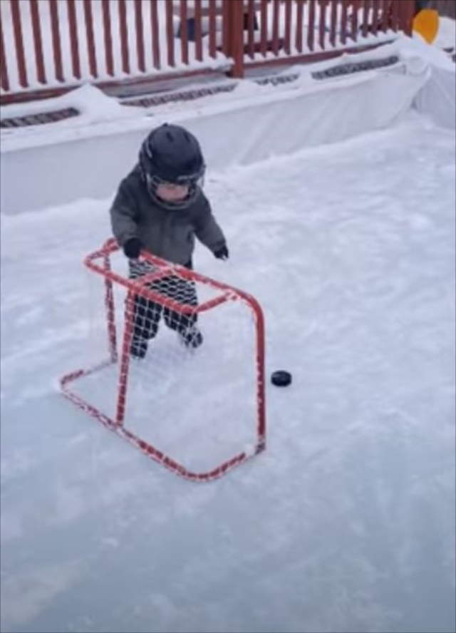 アイスホッケーをする1歳の幼児。よちよちと動く姿は等身大の1歳という感じですが、ゴールの決め方は驚きの方法でした!一体どんな手段を試みたのでしょうか!?