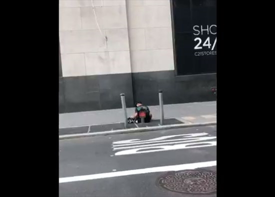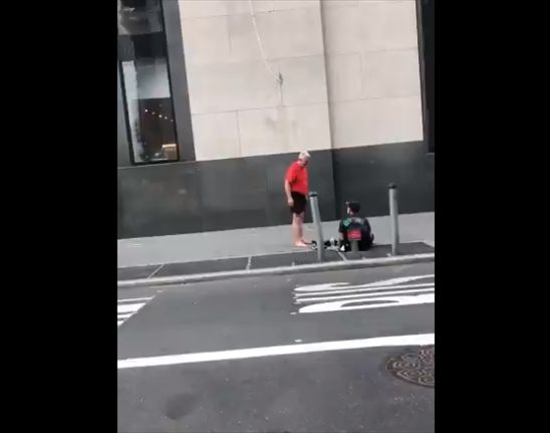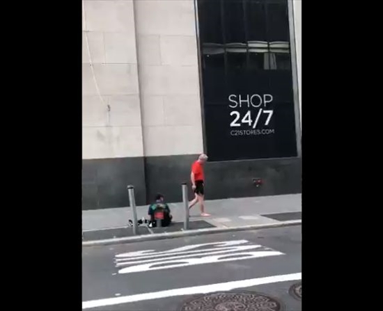 投稿されたのは、TwitterユーザーのAntonella212(@NYorNothing)さん。米ニューヨークのマンハッタンで、歩道に座り込むホームレスと例の男性とのやりとりを動画におさめています。