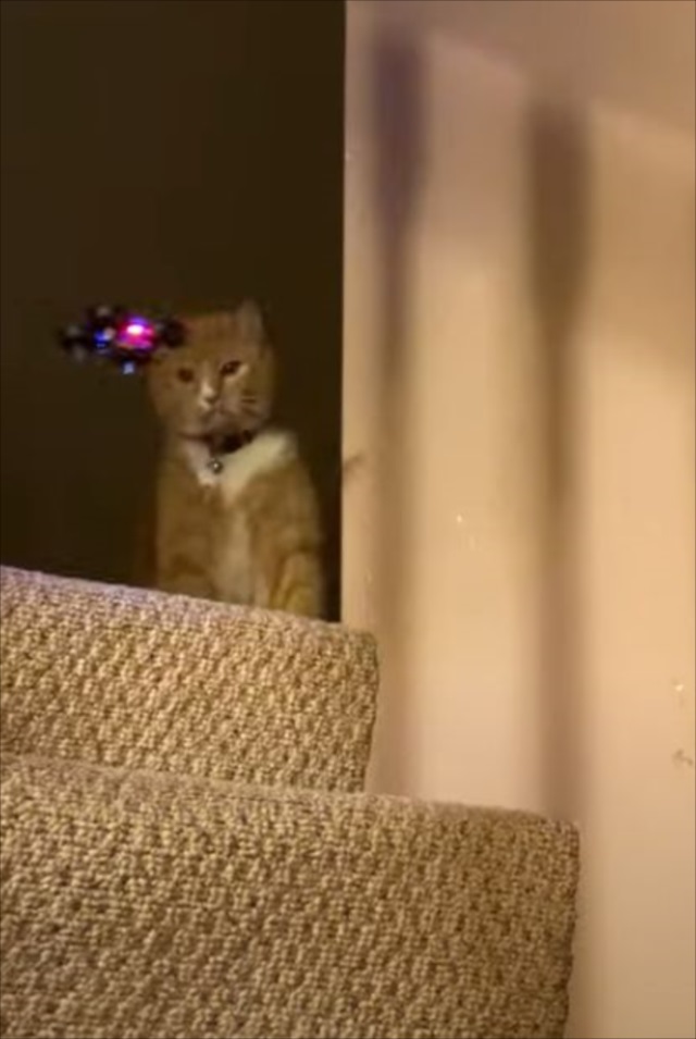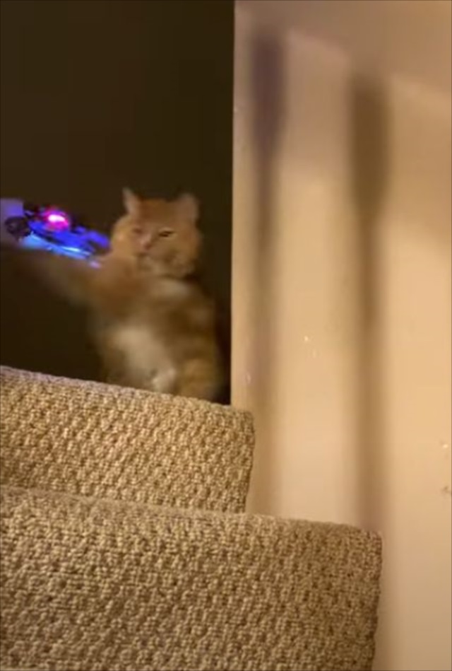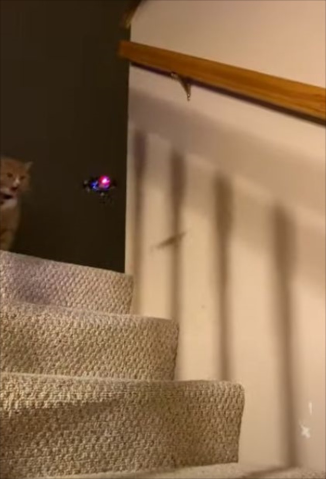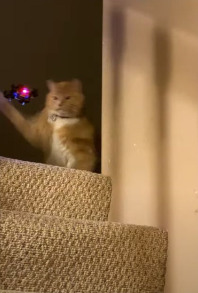 ミニドローンをながめているニャンコ。この段階では、これから攻撃を仕掛けるとは思えない雰囲気です。