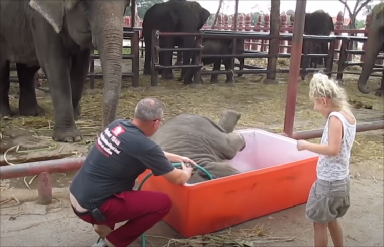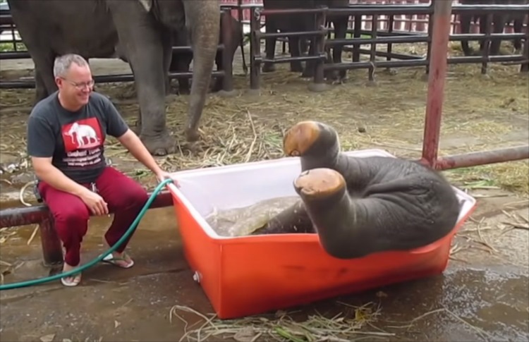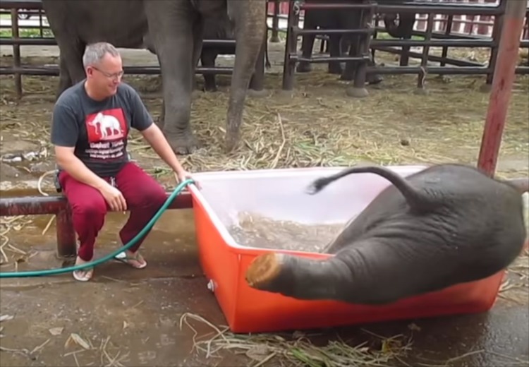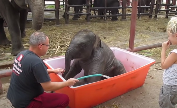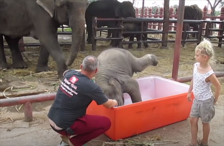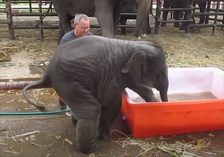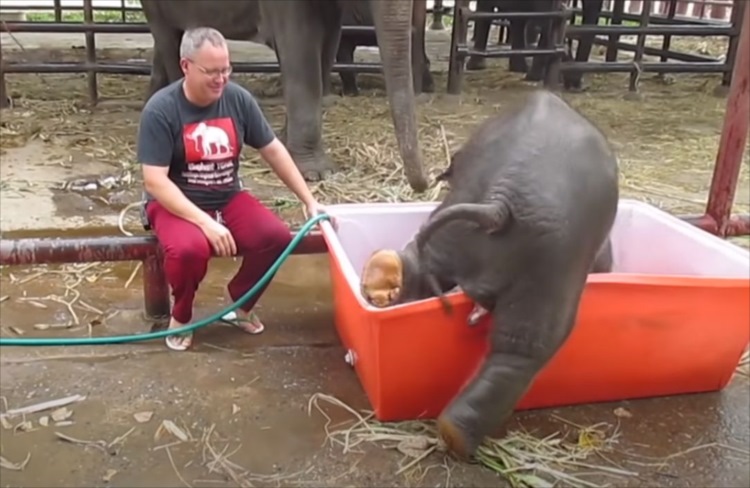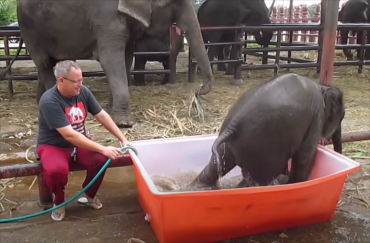 一度お風呂の外に出たゾウの赤ちゃん。再びまたいで入ろうとすると・・・