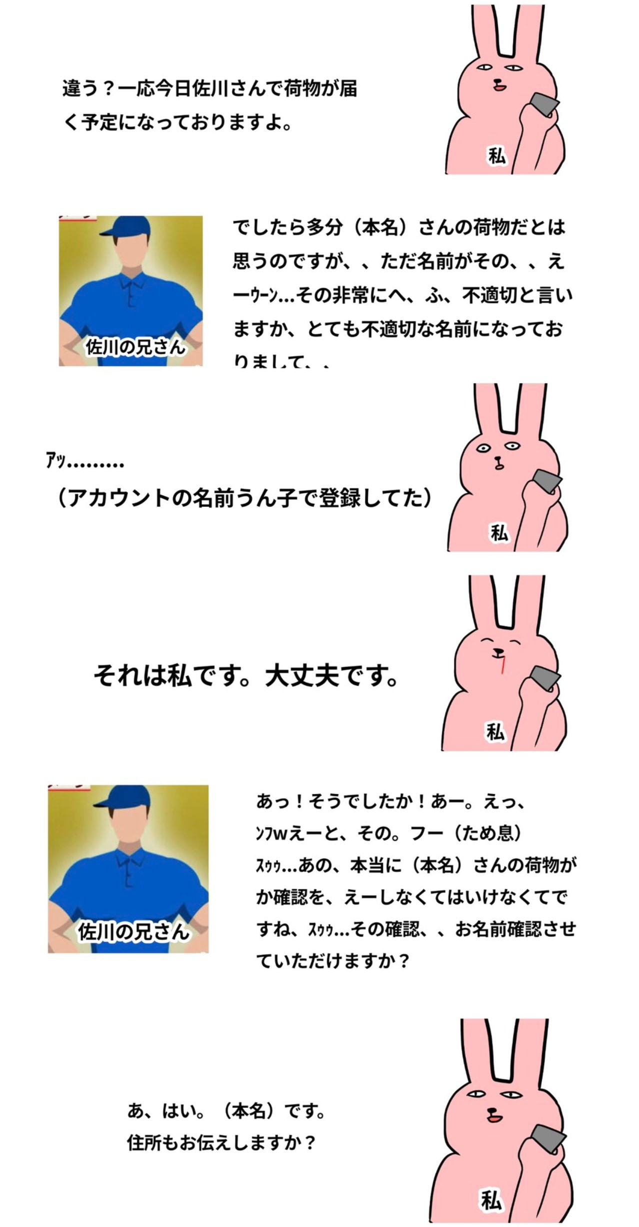 宅配便の送り先名となる氏名欄に「うん子」と登録していた愛さまさん。その事が理由で本人確認の電話をかけてきた配達員さんは、「私の口から言えませんのでちょっと(笑)」と愛さまさんに荷物に記載されている名前を尋ねます。