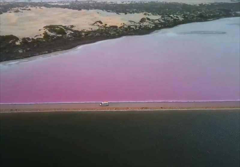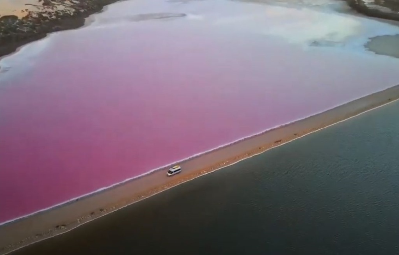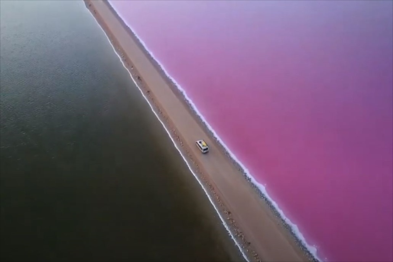 “おとぎ話の世界”のような、ピンク色の湖を走って行く車。何度見ても不思議で魅力的な光景は、ぜひ動画でもご覧ください!