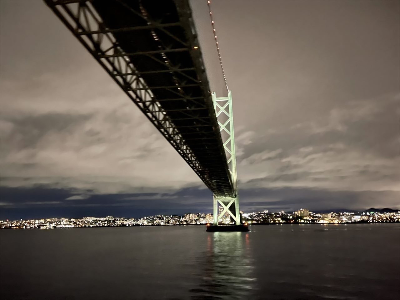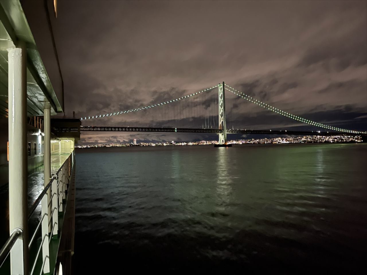 昼間は濃霧ですごいことになっていた明石海峡大橋を阪九フェリー「つくし」でくぐります!