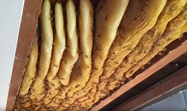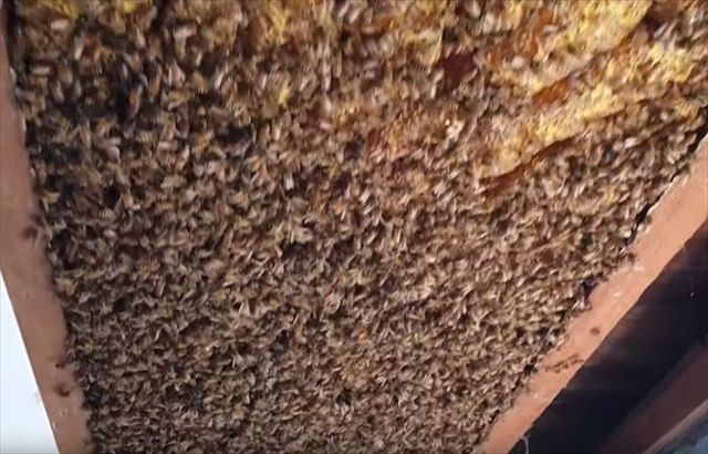 話題となっている蜂の巣が発見されたのは、とある住宅の天井裏。最近ミツバチが増えてきたことから気になって養蜂家に依頼して天井を開けたところ、超巨大な蜂の巣が!まるで養蜂場!