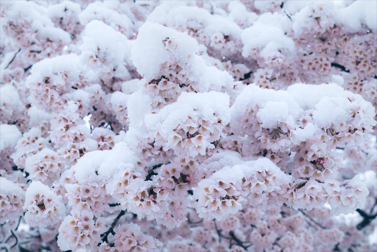 ピンク色の満開の桜にかかった真っ白な雪。冬と春の風物詩が同時に見られるなんて・・・まさに、自然が生み出した奇跡の光景ですよね。