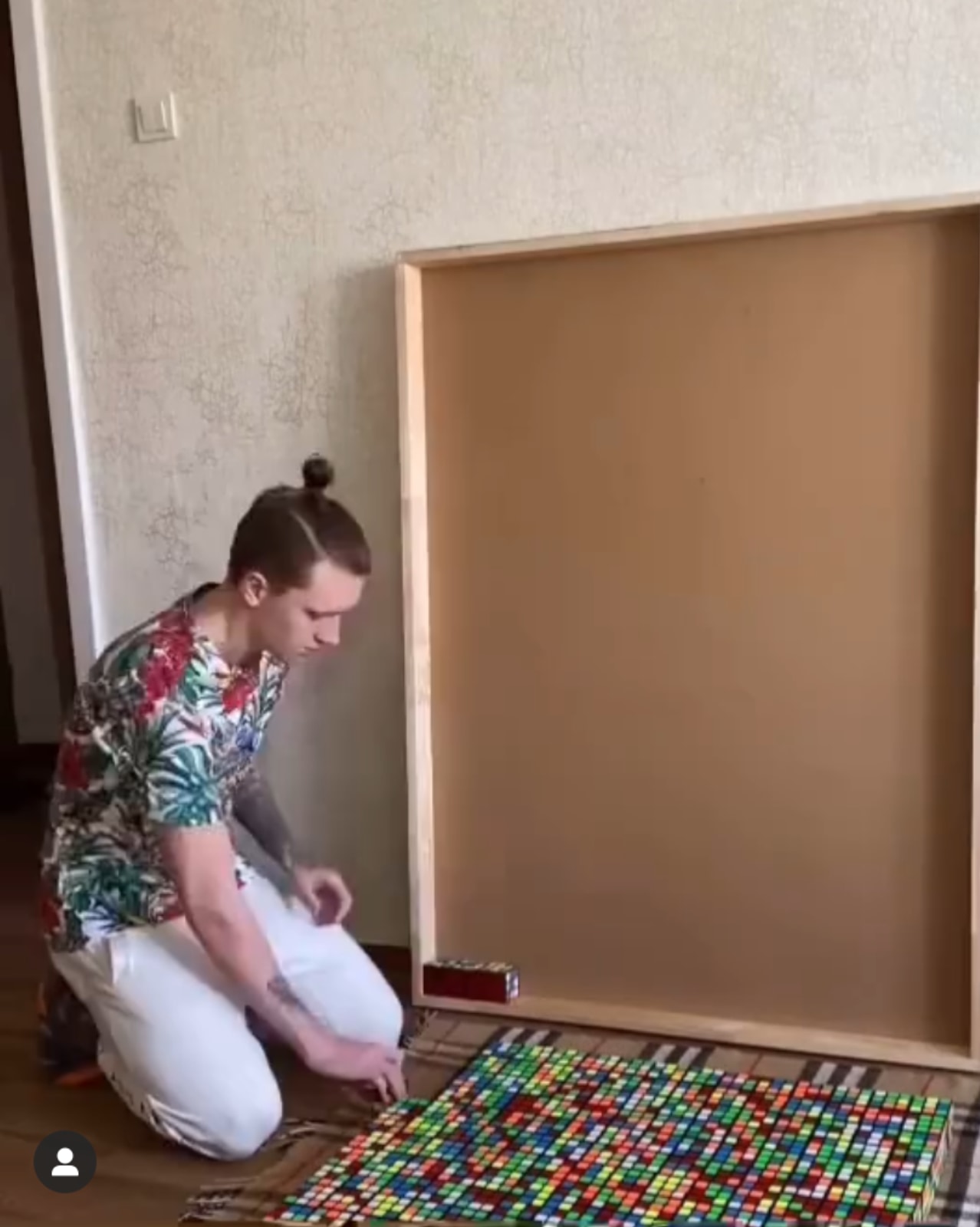 danil.gavrishさんはルービックキューブを回転させ、木のフレームの中に一つずつ並べ始めます。