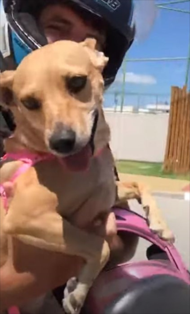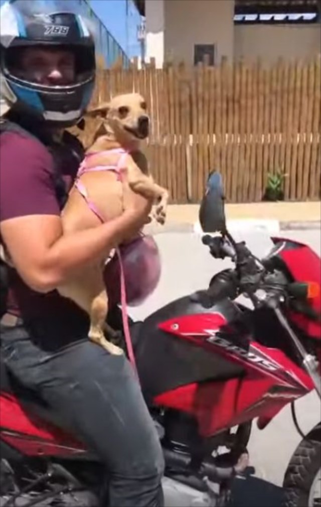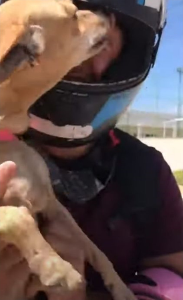 興奮する愛犬を見て嬉しそうな飼い主さん。ワンコは、飼い主さんが運転するバイクでお出かけするのが大好きなのでしょうね!