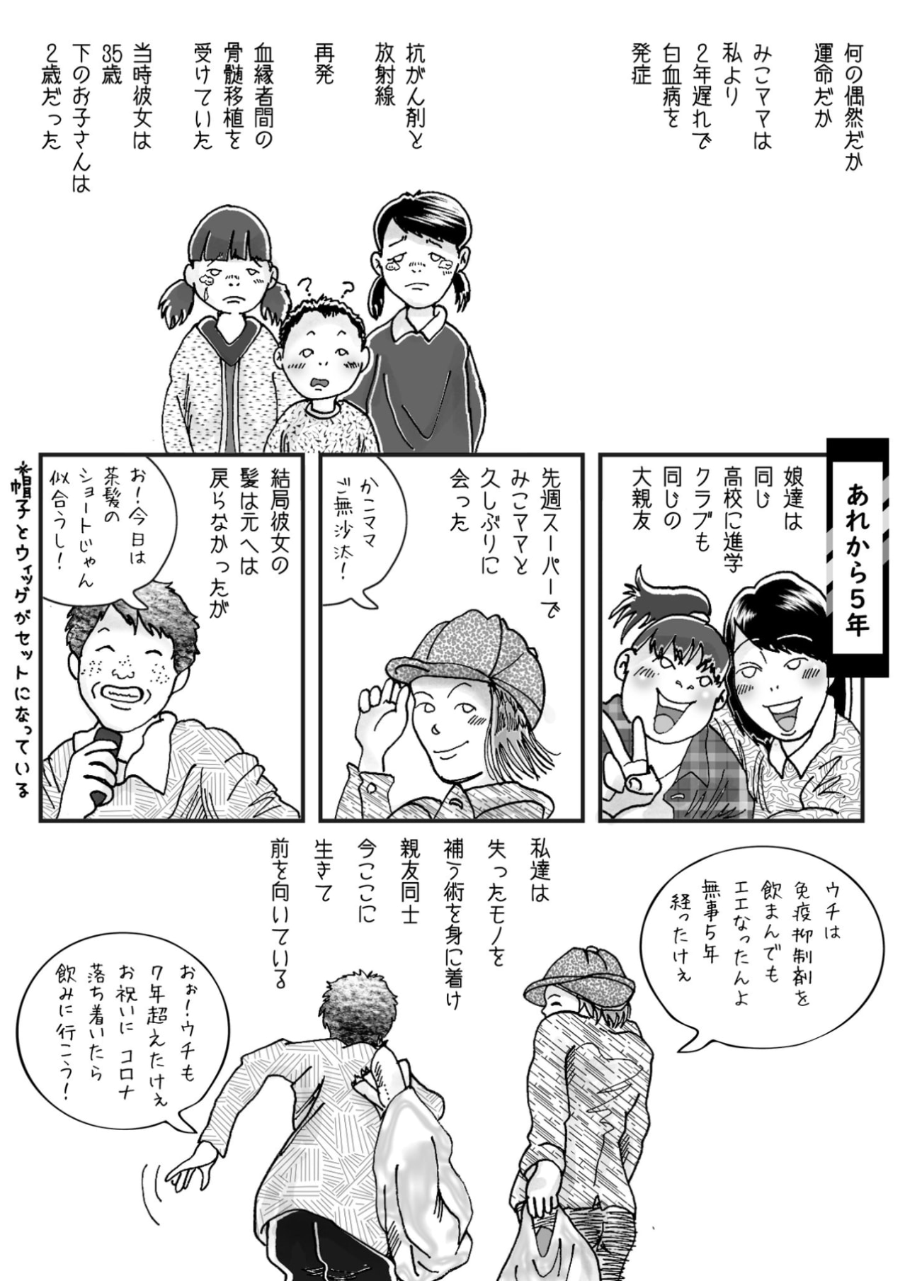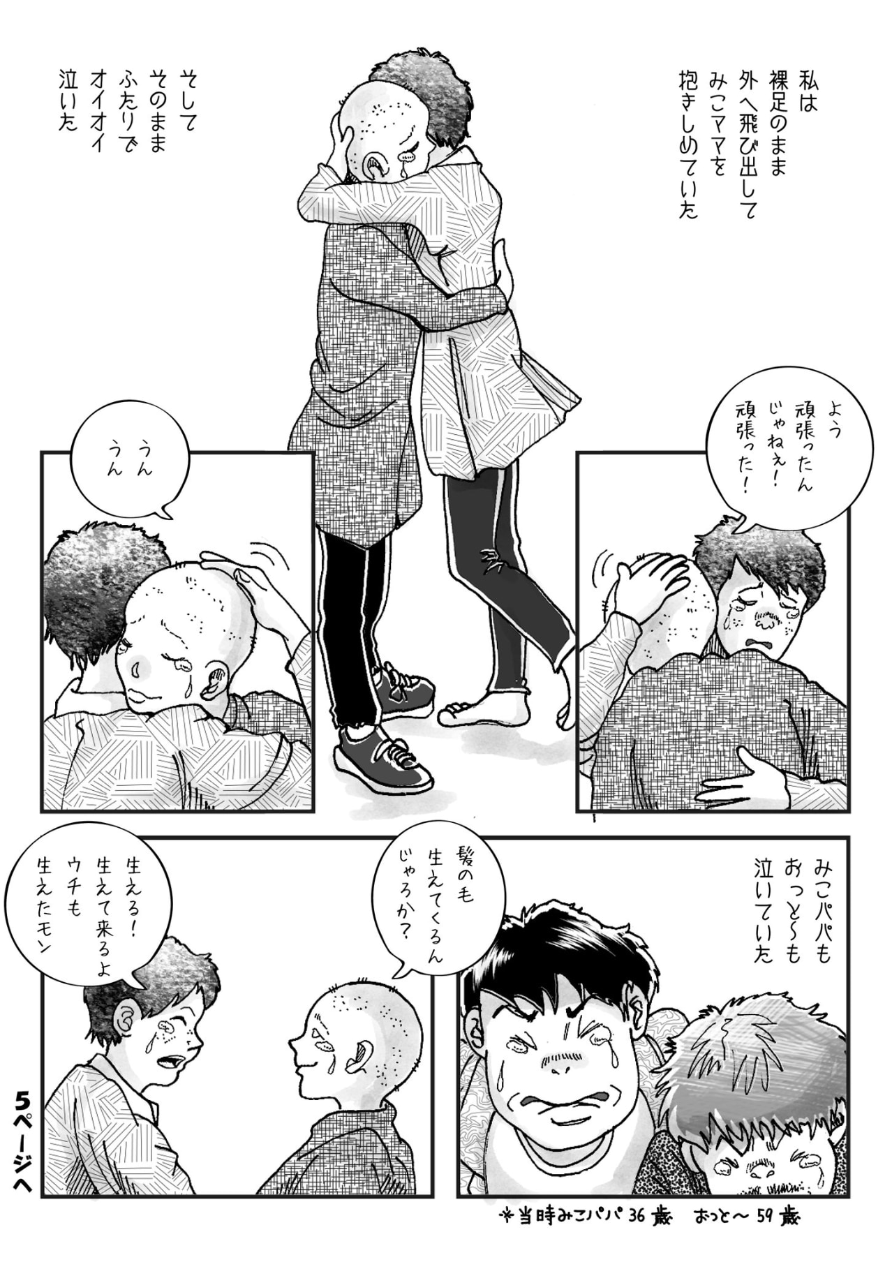 それから2年後、今度はそのママ友が白血病を発症。KAKOさんは、治療で髪の毛が抜けてしまった姿で気丈に振る舞うママ友を裸足のまま咄嗟に抱きしめ、一緒に涙を流して「頑張った!」と声をかけます。