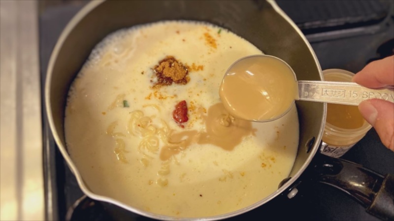 付属の粉スープ、豆乳300ml、ねり胡麻大さじ2、豆板醤小さじ1/3、砂糖小さじ1/2、ラー油少々を加えれば・・・