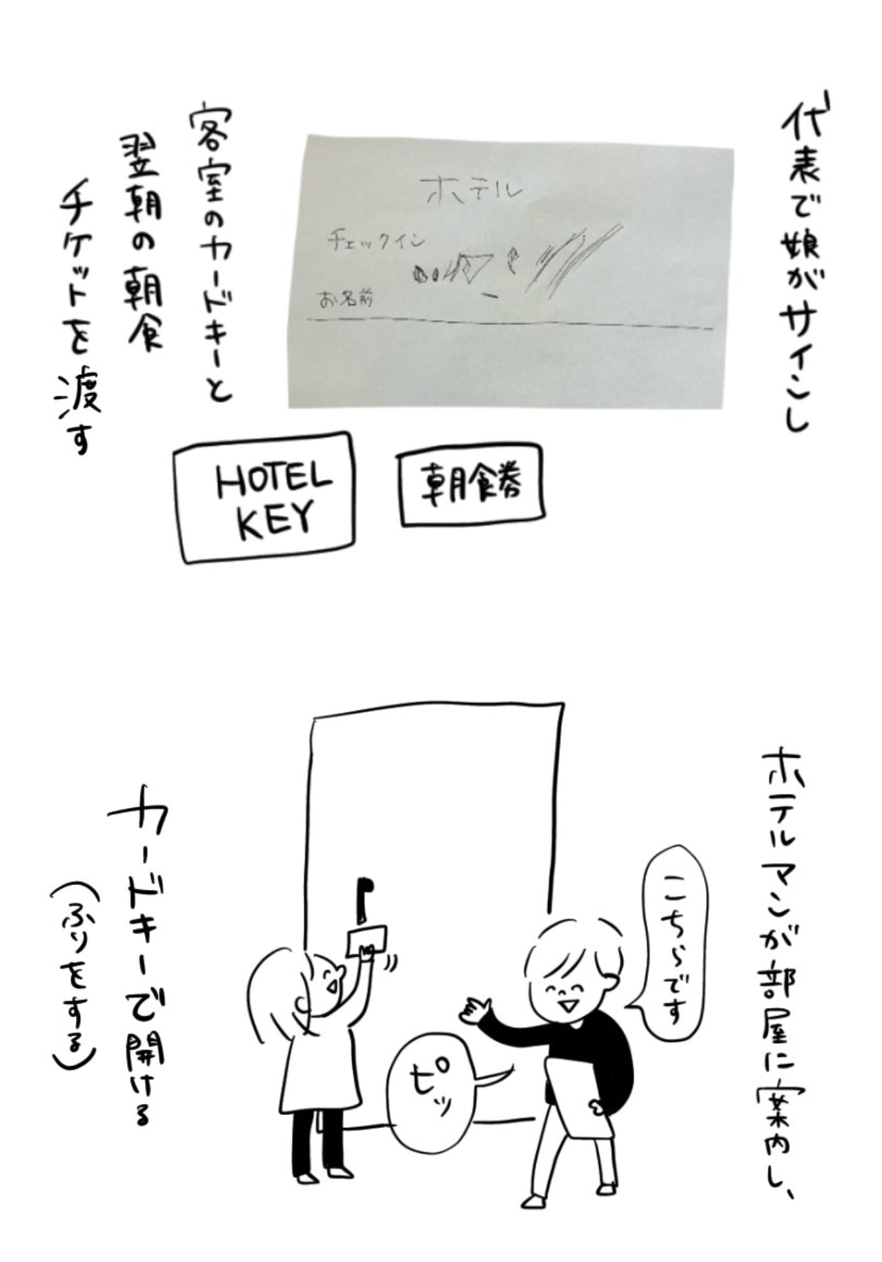 いつも寝ている部屋の隣の部屋を客室にして、ホテル滞在気分を満喫。一旦外に出てから来館するところや、チェックイン手続きで客室のカードキーと翌朝の朝食チケットが渡されるシステムなど、あちこちにホテルのような演出が取り入れられていて、とってもワクワクするプロジェクトですよね。