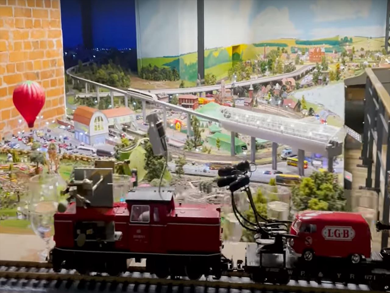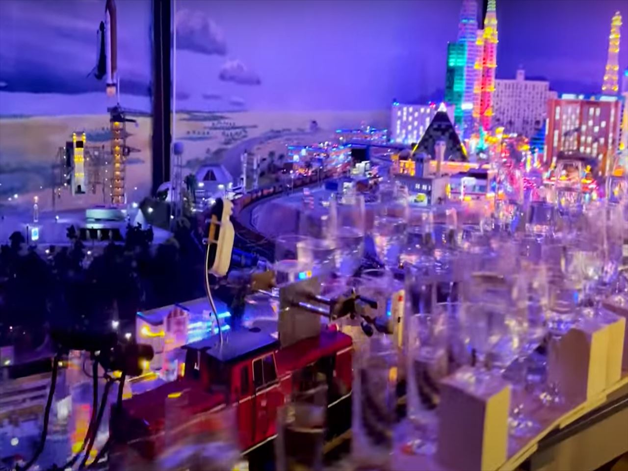 鉄道模型の車両に取り付けた棒で、水の入った2840個ものワイングラスで名曲を演奏します。