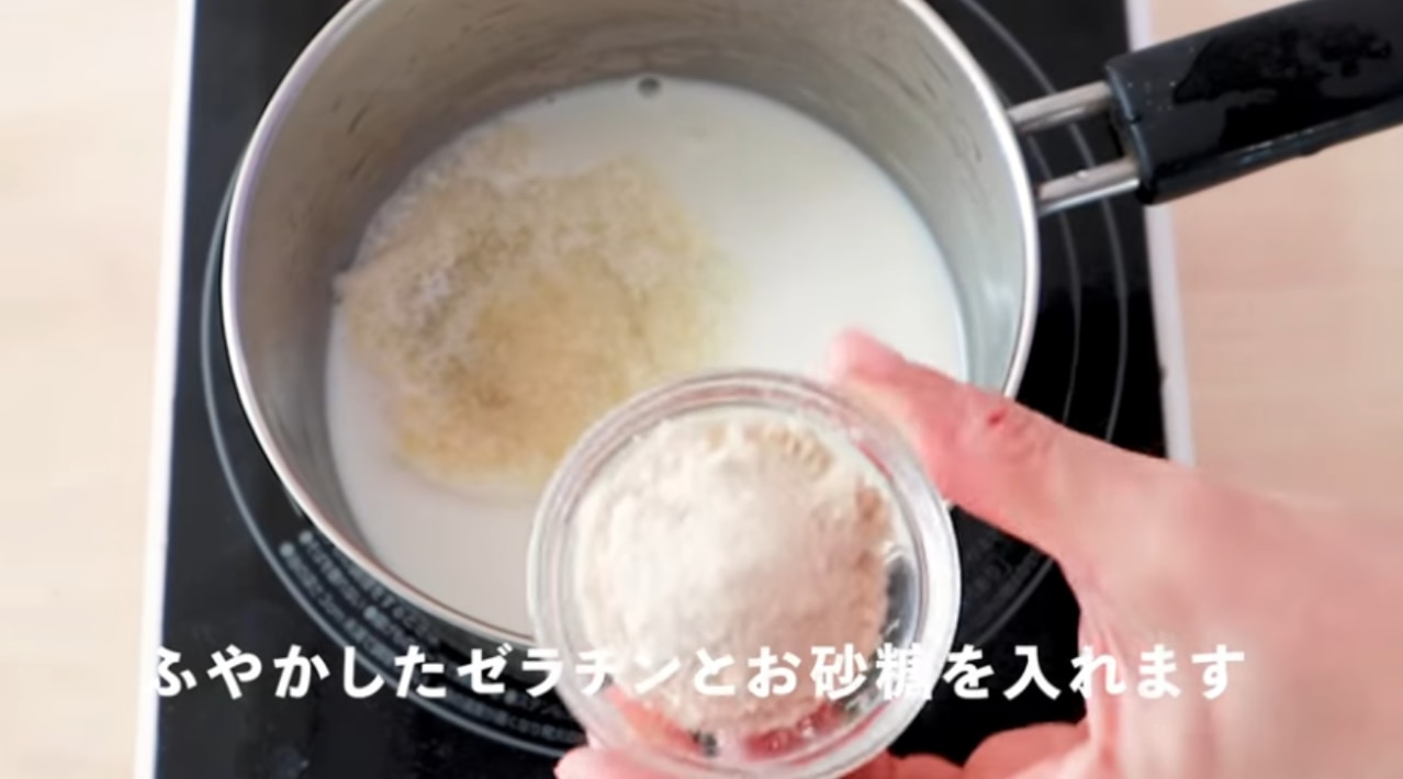 ③ふやかしたゼラチンと砂糖を②に入れて溶かす。湯気が出てきたら火を止めて余熱で溶かす。※ゼラチンは熱を与えすぎないよう注意!